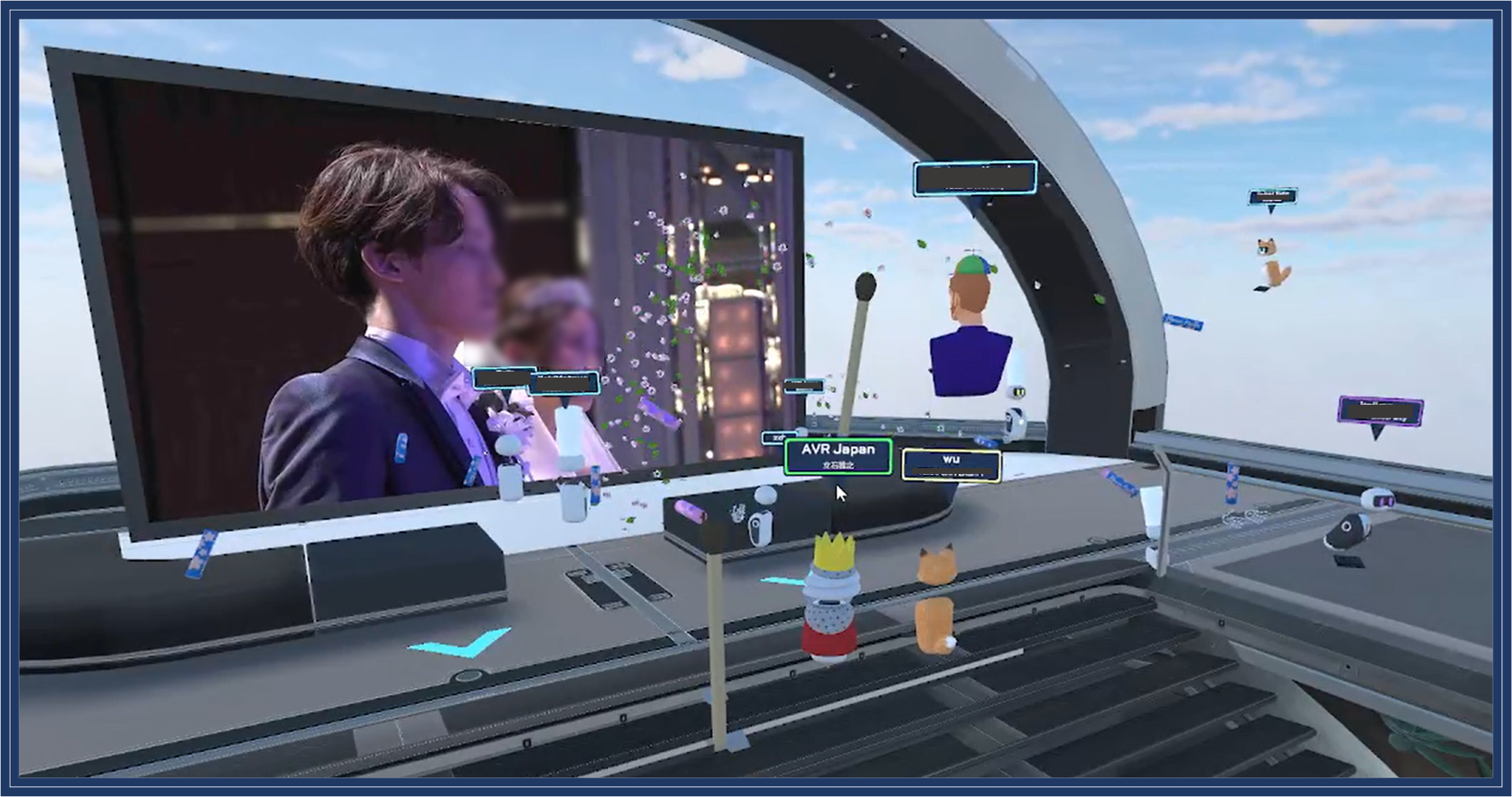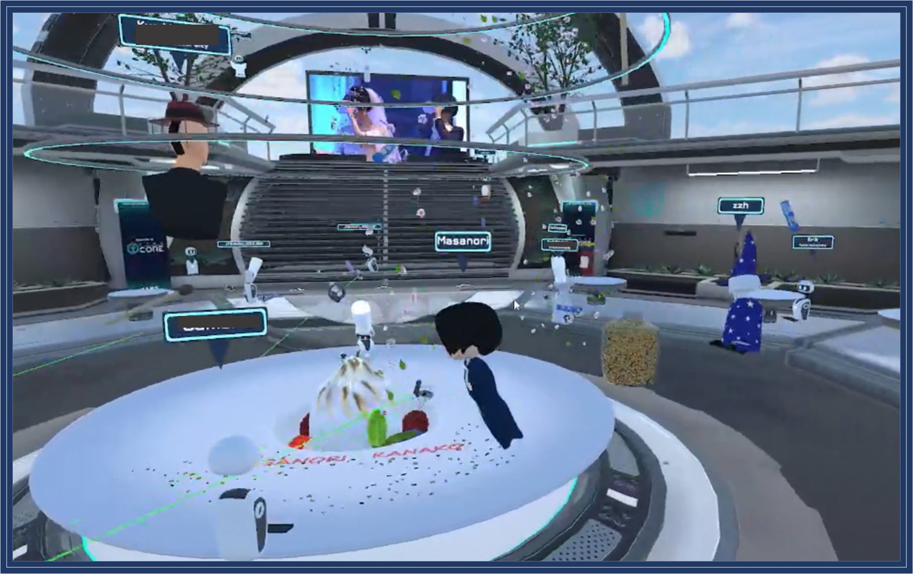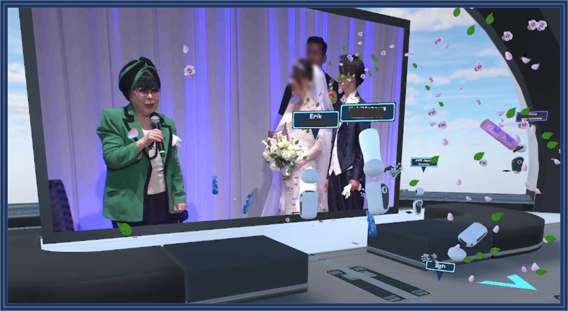 メタバースプラットフォーム「CORE」(https://xrpaddle.co.jp/core/)内のウェディング会場に24名の新郎新婦の友人がアバターとなり各地より入室し、現地映像、音声だけでなくフラワーシャワーなどで二人の結婚をお祝いしました。