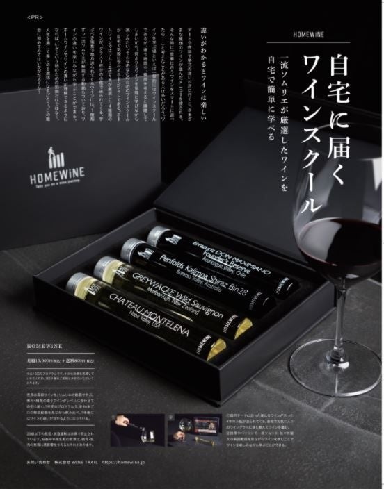 「ホームワイン」は、自宅でワインを嗜み学ぶ、新時代のワインプログラムです。全12回の定期学習サービスで、全世界の高級ワインを飲み比べながら、実際に使える知識をお届けします(https://homewine.jp/)。