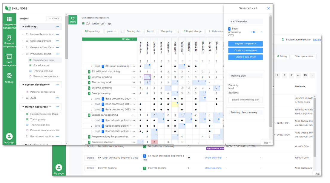 SKILL NOTEは、製造現場で従来より紙・Excel・ハンコ等で管理されてきたスキルマップ(力量管理表)をクラウド上で運用するSaaSです。製造現場のスキル/教育データがクラウドに登録され見える化が進むことで、スキルデータを活用した計画的な人材育成・人材配置を実現し、”技能承継”、”多能工育成”、”即戦力化”といった製造業企業様の人材管理に関する課題の解決に貢献します。