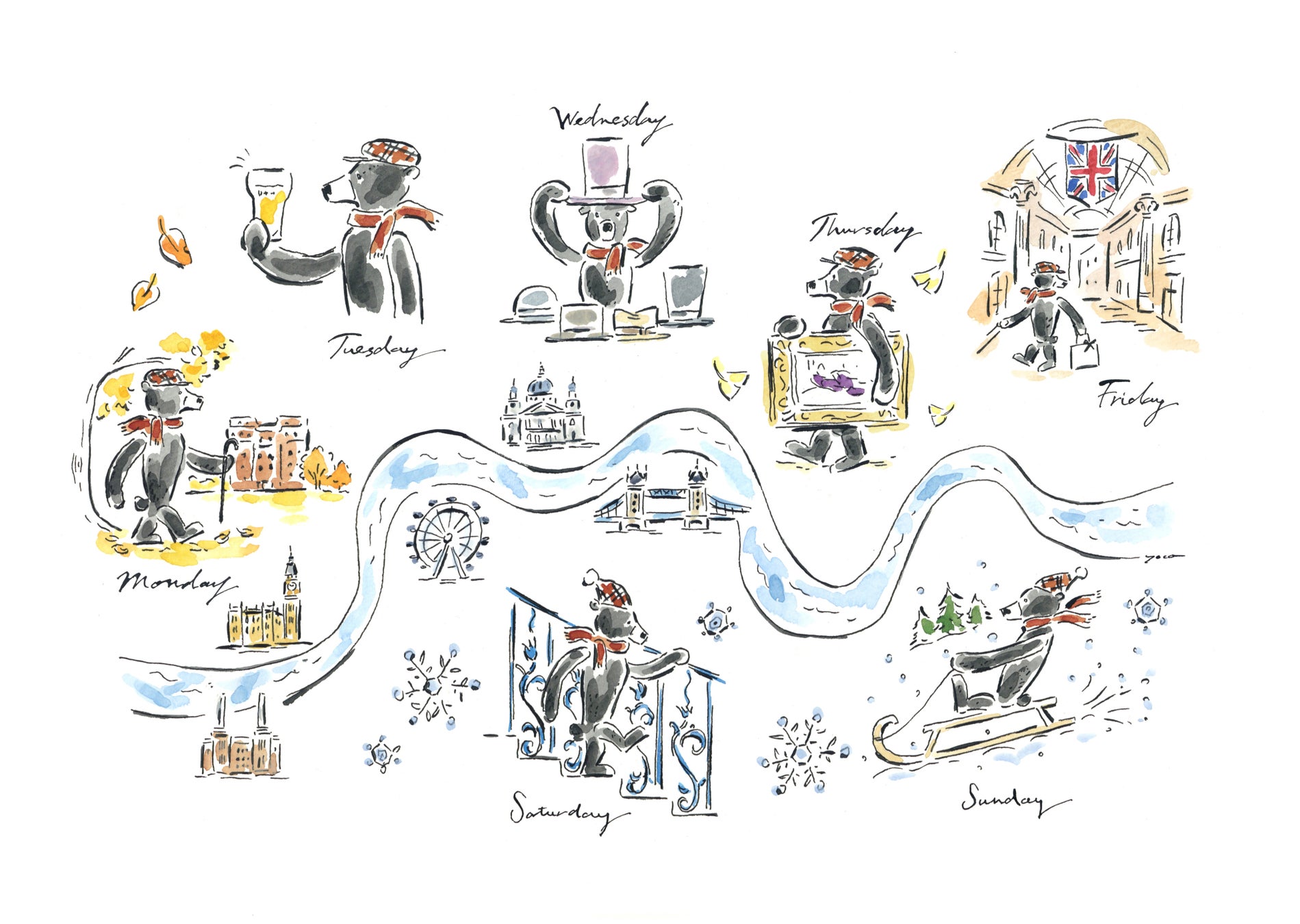 2023秋冬のテーマ“A Week with DAKS(DAKSと過ごす1週間)”に沿って、主人公 紳士“ジャーニー”がロンドンで過ごす1週間を一つのイラストで表現しています。
