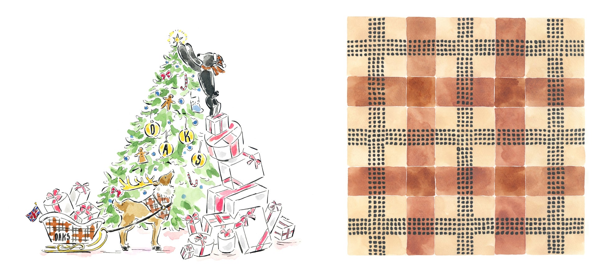 他にも、秋冬らしいクリスマスモチーフに加え、ブランドのアイコンであるチェック柄やDDロゴを永宮さん独特の水彩画タッチで描いていただきました。