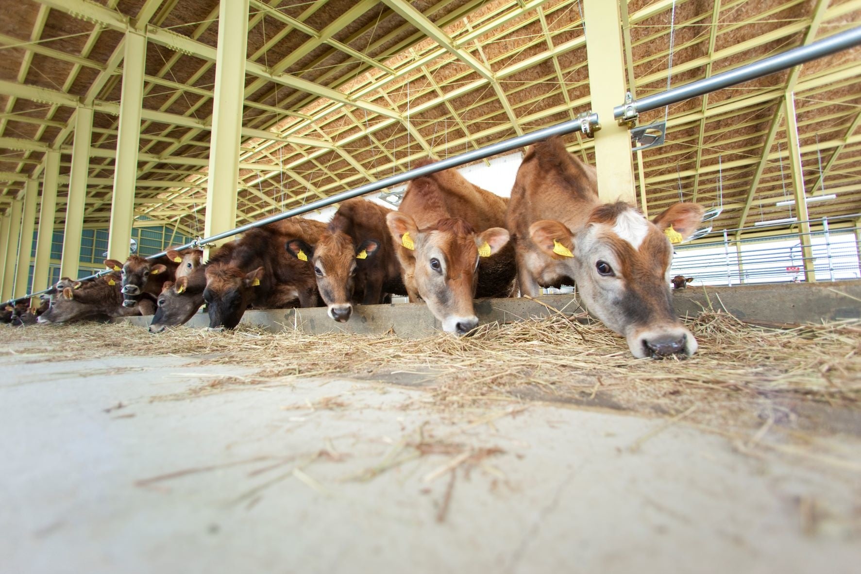 ジャージー牛乳は、「ファームズ千代田」さんよりわけていただきます。ジャージー牛にストレスがないように健康的な飼育方法を目指す"アニマルウェア"の考えのもと、牛たちのことをよく考えながら飼育していらっしゃいます。ジャージー牛はホルスタインに比べ搾乳量が少なく、生産量は限られており、国内で1%にも満たない、大変稀少な品種です。