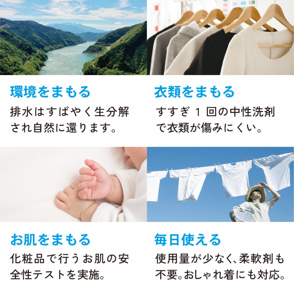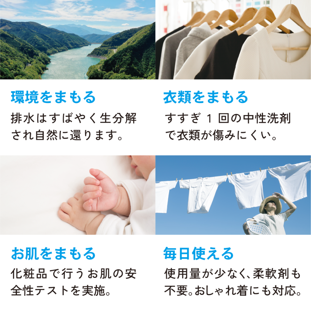 当社の洗剤の特徴である「油をナノレベルに分解し、水で包む技術」により、環境への負荷軽減、肌や生物への安心・安全を得ることができます。