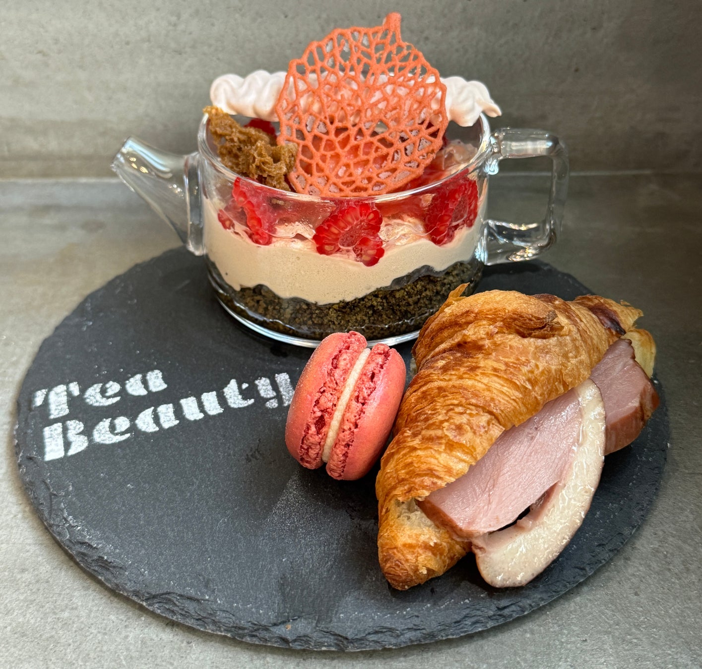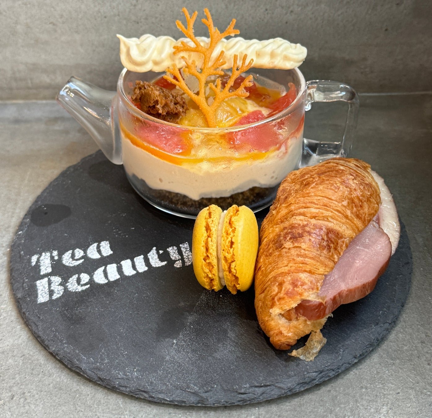 ◼️構成:キーマンクランブル、キーマンクリーム、キーマンソルベ、白ワインとライチのジュレ、ルビーグレープフルーツ、パッションフルーツソース、パッションフルーツメレンゲ、パッションレモンマカロン、紅茶鴨のクロワッサンド