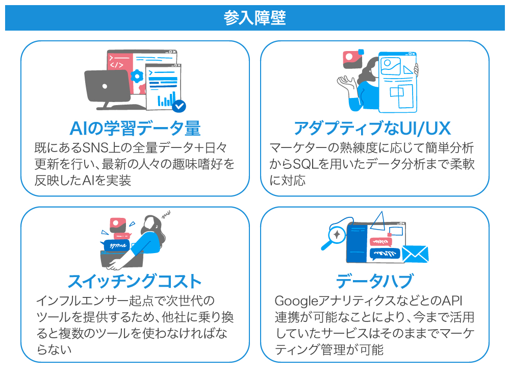 弊社はすでにYouTubeとインスタグラムを中心に活躍しているインフルエンサーアカウントのデータを収集、分析しており、データの量と質において他社の参入障壁を構築していると考えています。今後も世界のインフルエンサーアカウントを収集し続けることに加え、TikTokやTwitterで活躍するインフルエンサーを提供することで自社の存在感を高めていく計画です。