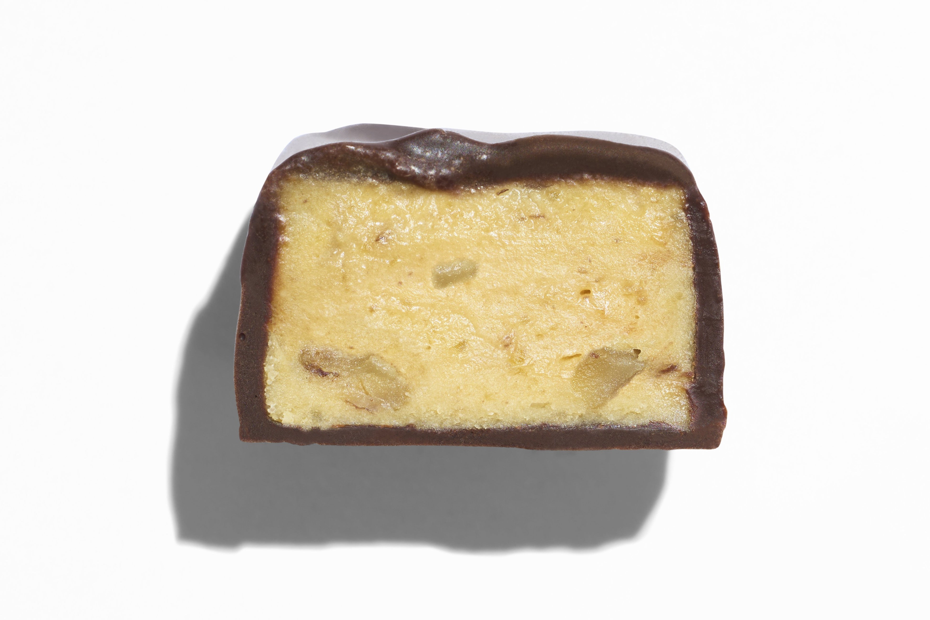 栗と相性の良いラム酒を香りづけ程度に使用し、ホワイトチョコレート・生クリーム・バターを合わせることで、テリーヌのようなまろやかなガナッシュに仕上げました。キャラメリゼしたローストペカンナッツを練り込み、ほろ苦さと香ばしさがある深い味わいをお楽しみいただけます。 -