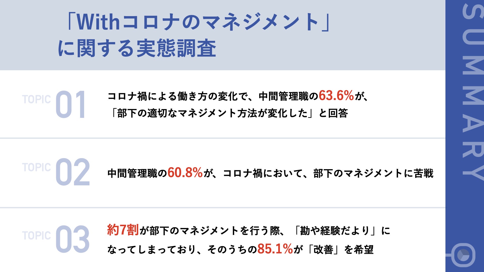 - 中間管理職の60.8%が、コロナ禍における「部下のマネジメント」に苦戦