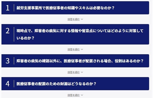 ・事業所を利用する障害者は、精神、身体、知的、発達、難病など多種多様な病気を持つことから、国の基準を満たした医療従事者を現場配置することが、支援品質の向上につながると考えられている。