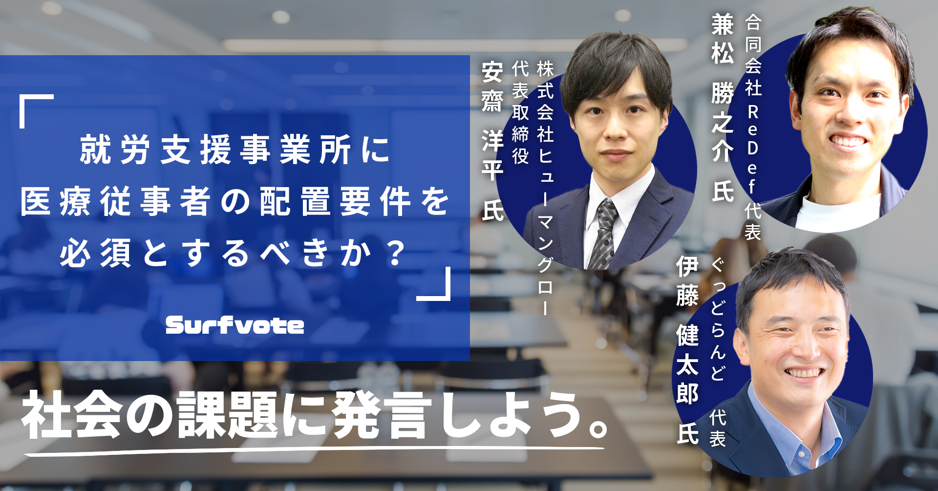 【障害者就労支援事業所に医療従事者の配置要件を必須とするべきか?】政策提言に特化したSNS「Surfvote」で議論が始まる