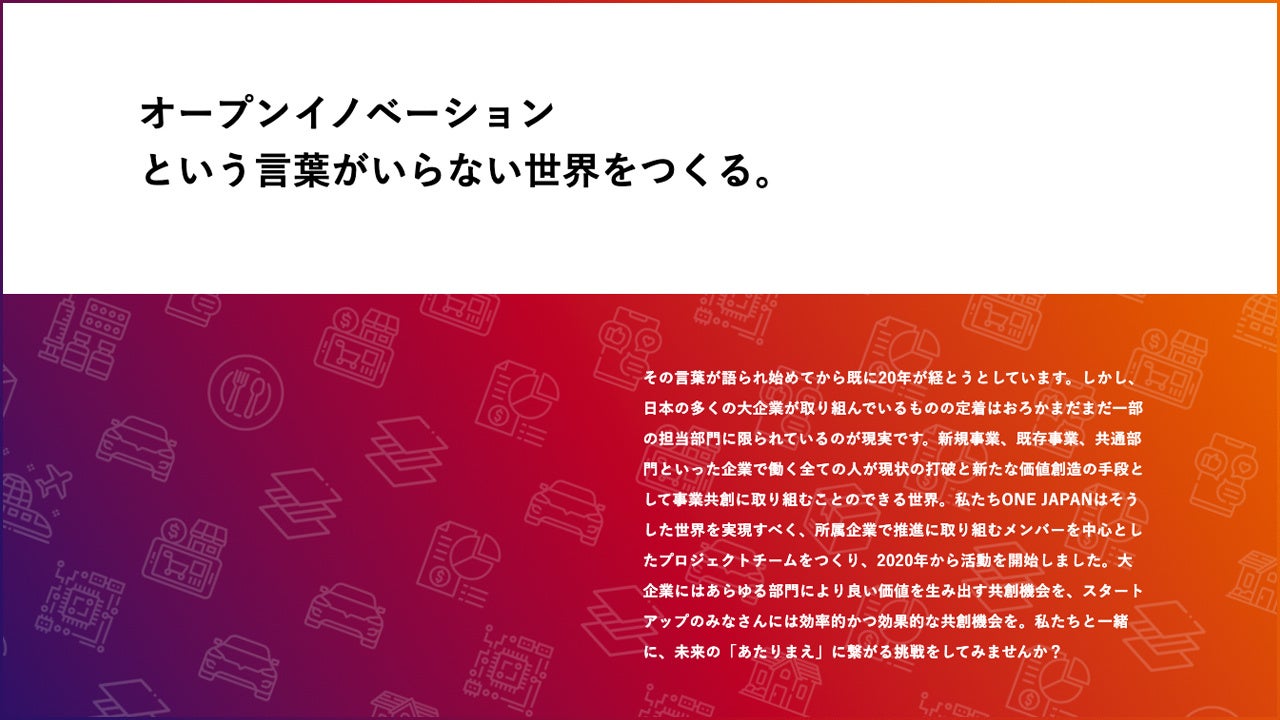 ONE JAPANは、本プロジェクトを通したスタートアップとのオープンイノベーションをはじめとして、今後も他セクターと連動した新たな価値づくりに取り組むことで、オープンイノベーションという言葉がいらないほど、それが当たり前の未来をつくることに挑戦します。