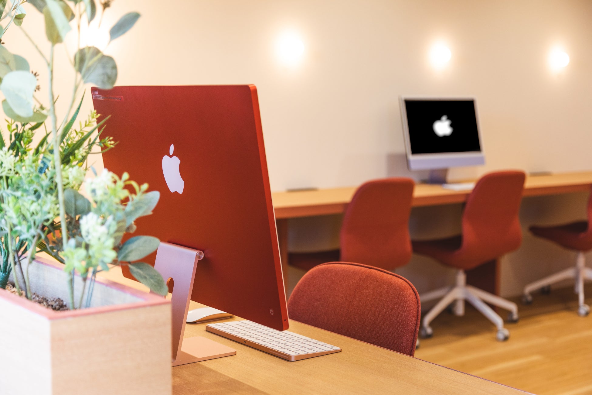 まるでアジトのような空間に広がる、21席のフリーデスク、集中ルームのアトリエ4席、会議室をご利用いただけます。また、高速Wi-Fiや全席コンセント付き、モニター貸出といった集中できるオフィス環境を備えており、作業効率を高めることができます。リモートワークの場所としてご活用いただけるほか、パソコンをこれから学びたいとシニアの方を対象にアップル社のiMacの貸出プランもご用意しております。