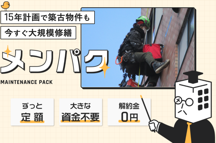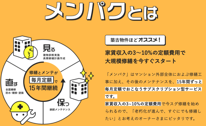 メンパクは外壁補修や塗装、防水工事等、マンション外部全体の修繕工事とその後のメンテナンスを毎月定額のメンテナンス料で行う、株式会社OWNERSCLUB社が発案・提供している日本初の定額制マンション修繕サービスです。通常なら一度に大きな費用の掛かる外部の修繕費を毎月の賃収から固定経費として処理できるため、安定した賃貸経営環境を生み出します。