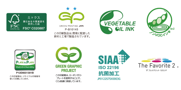 自社で独自開発した環境配慮型高品位印刷ソリューションのマークです。インキ使用量が削減できると共に、発色の良い印刷が可能となります。The Favorite2で印刷した製品に表示できます。商標登録済み。