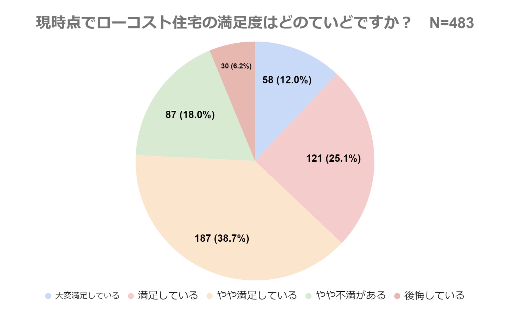 次にローコスト住宅の満足度についてもアンケートを実施したところ、「やや満足している」と回答した方が187人(38.7%)で最多となり、「満足している」が121人(25.1%)と続きました。