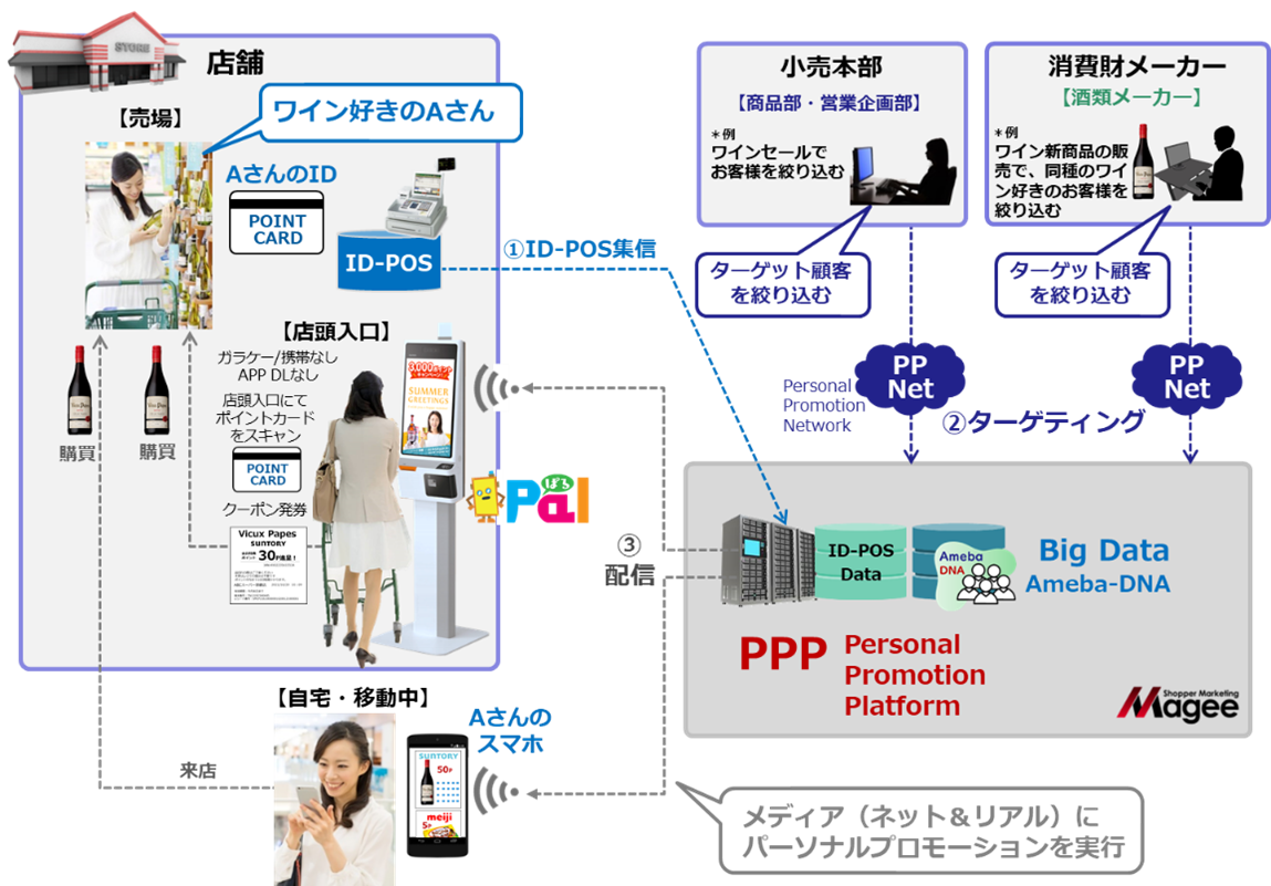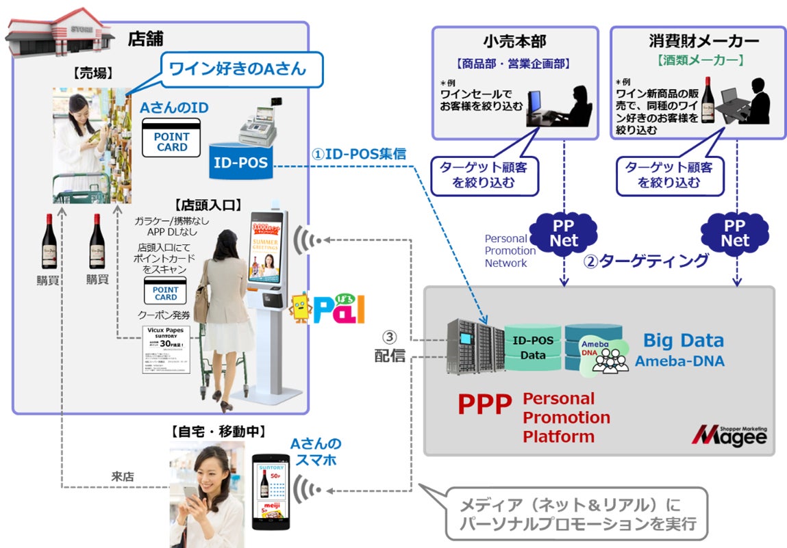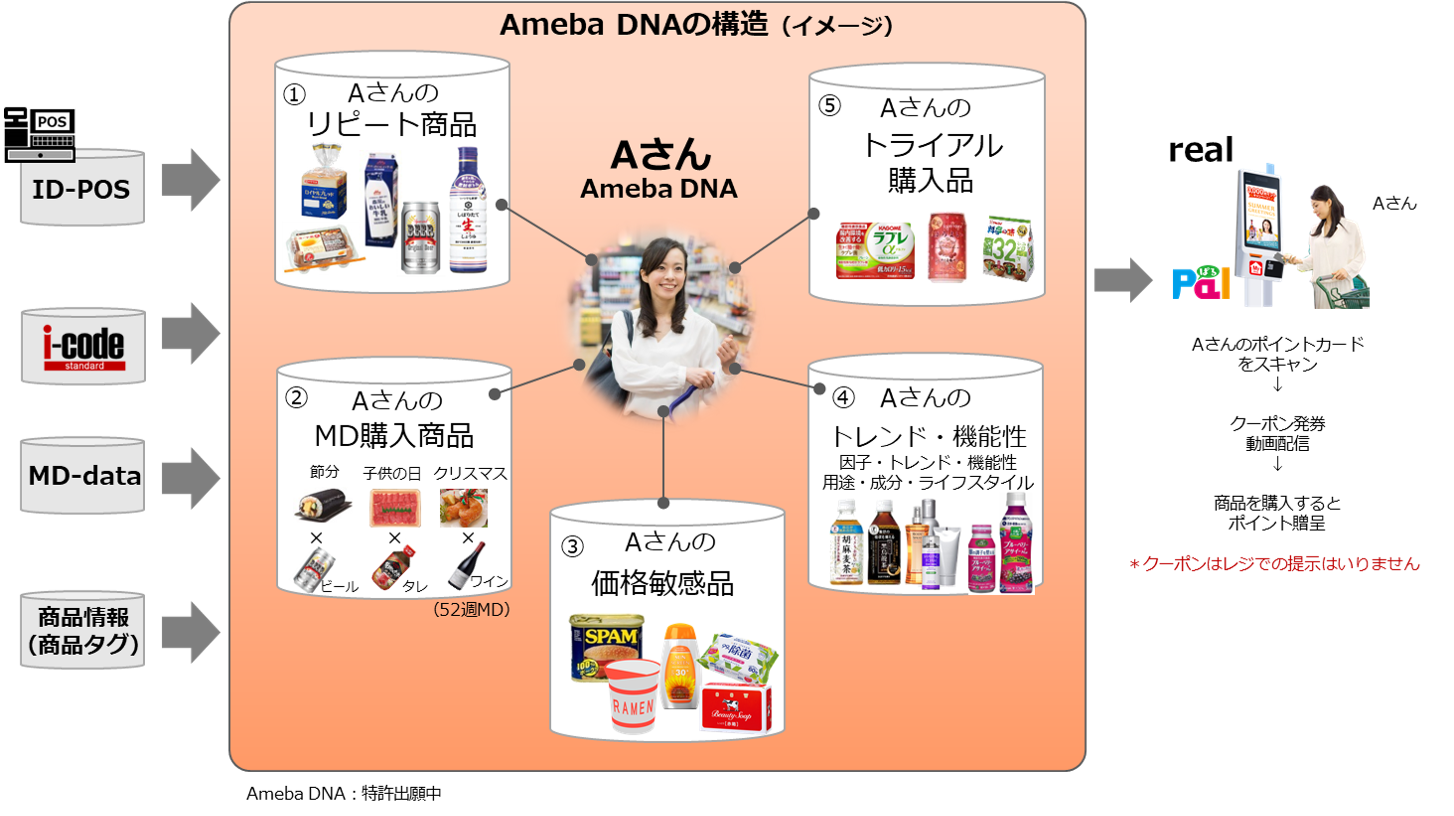 店頭ストアメディアサービスは、顧客の購買履歴を分析し、お客様に合わせたクーポンや動画配信が可能なサービスです。このサービスは、導入企業が保有する購買履歴を含む顧客データ(ID-POS)を収集し、マギー独自開発の地域データ(i-code)や商品情報、MD情報などと組み合わせたビッグデータとしてデータベース化します。このデータベースを利用し、お客様と商品の関係を分析し、一人一人異なるDNA(Ameba DNA)を生成します。このDNA(Ameba DNA)を活用することで、一人一人異なる、購入可能性の高い商品のプロモーションを実現します。