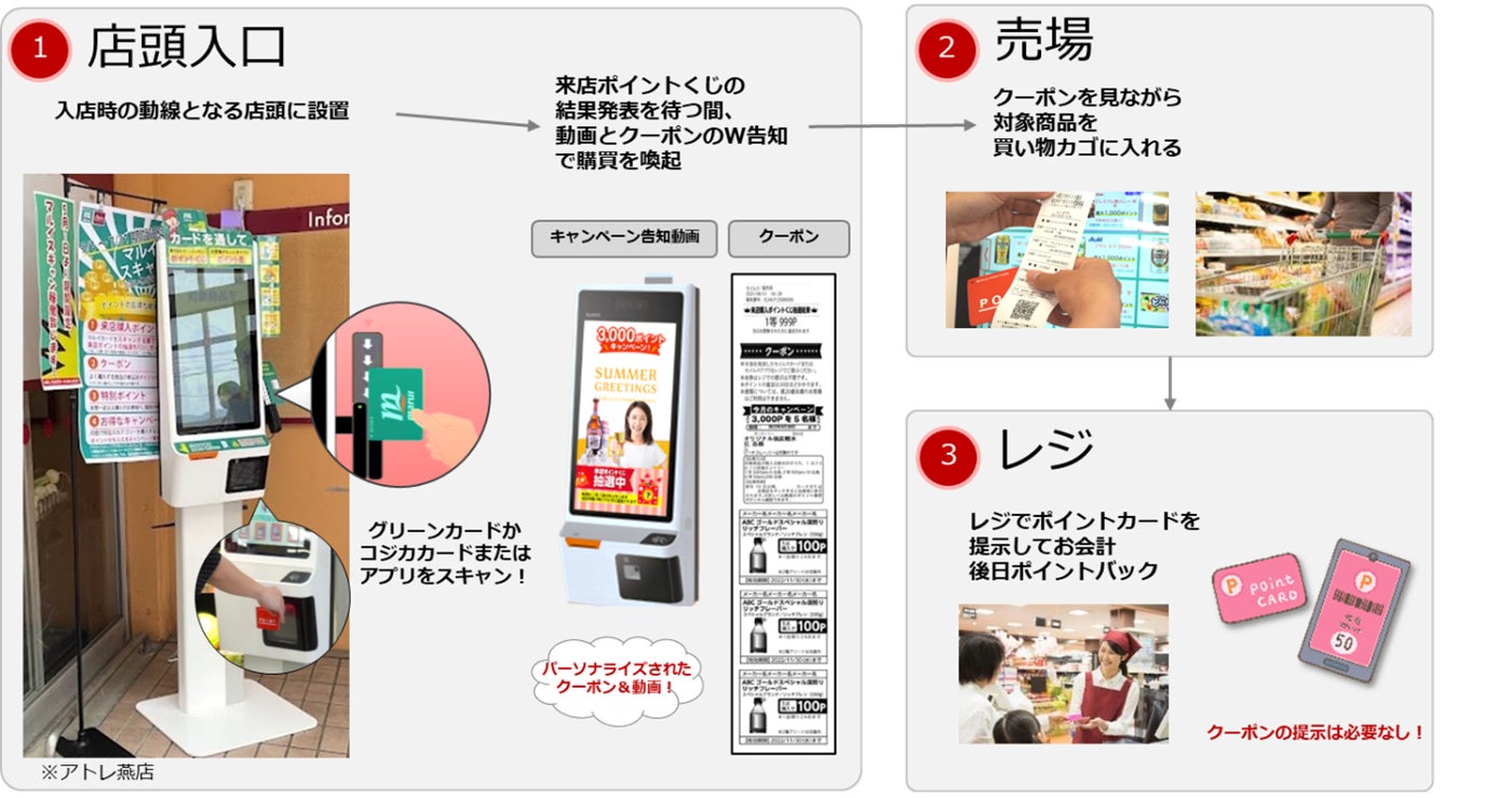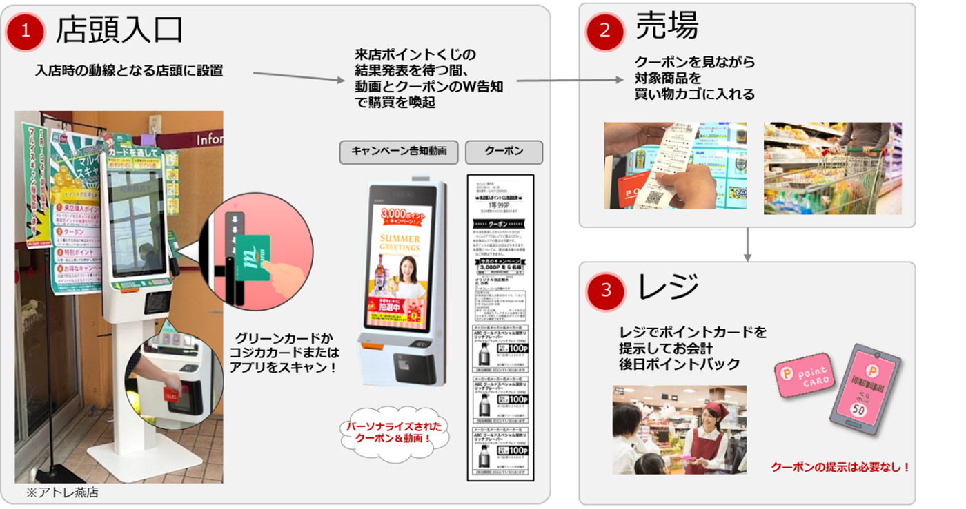 店頭では、クーポン・キャンペーン・来店ポイントくじの3つのサービスを利用でき、カードをスキャンするだけで簡単に利用できます。各購買データは、その人のDNAとして更新され、次回来店時にはまた異なるプロモーションが実施されます。