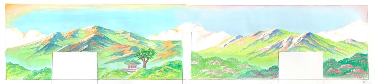 御所をモチーフとした銭湯ペンキ絵を2日間にかけて、一気に書き上げる予定です。御所宝湯に魂が吹き込まれる瞬間にお立ち会い頂ければ幸いです。以下は製作イメージです。