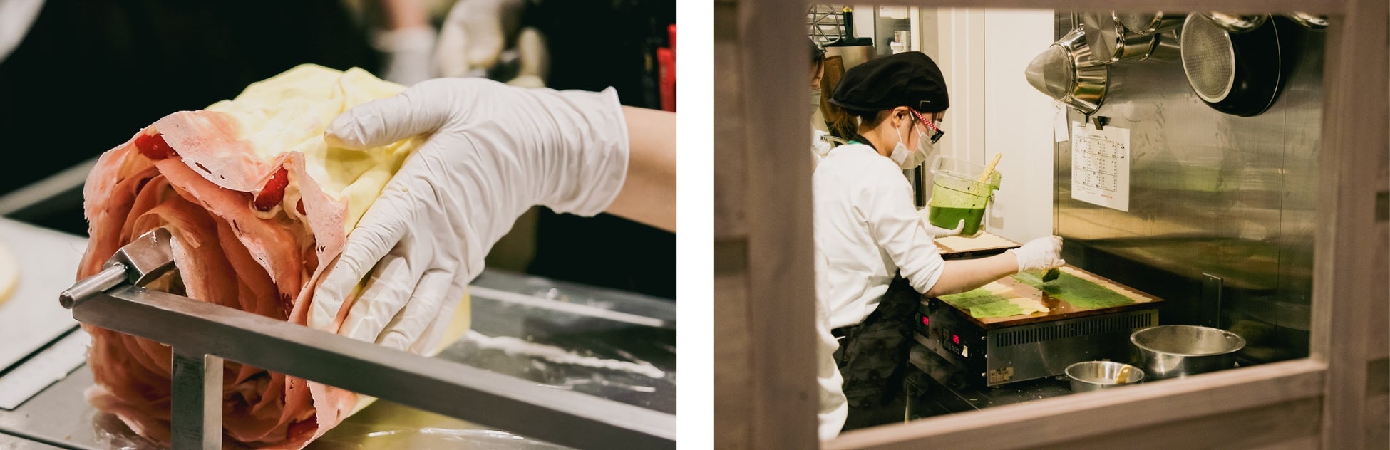 北海道純生クリーム、発酵バター、ブランド卵を使用した特製カスタードクリーム。焦がしバターで繊細に焼き上げた生クレープ。新鮮なフレッシュフルーツ。それぞれの良さを引き立たせる厳選した素材を使用しています。