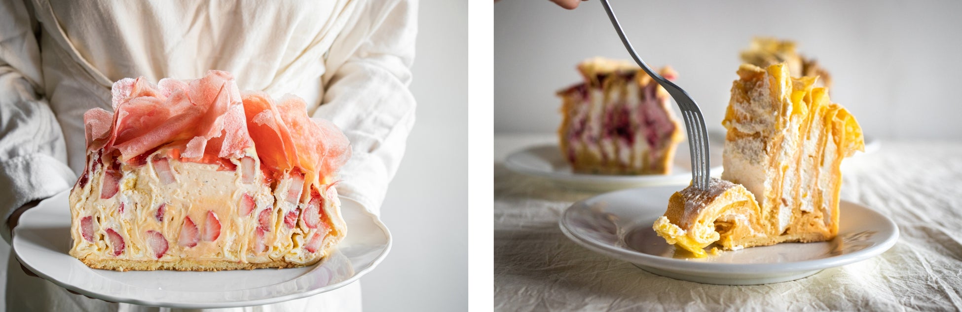 一般的なミルクレープは、どれもフルーツとクリームとクレープ生地を上に積み上げて作るもの。そんな常識的なミルクレープに遊び心をプラスし、大きな一輪のミルクレープのお花を咲かせました。