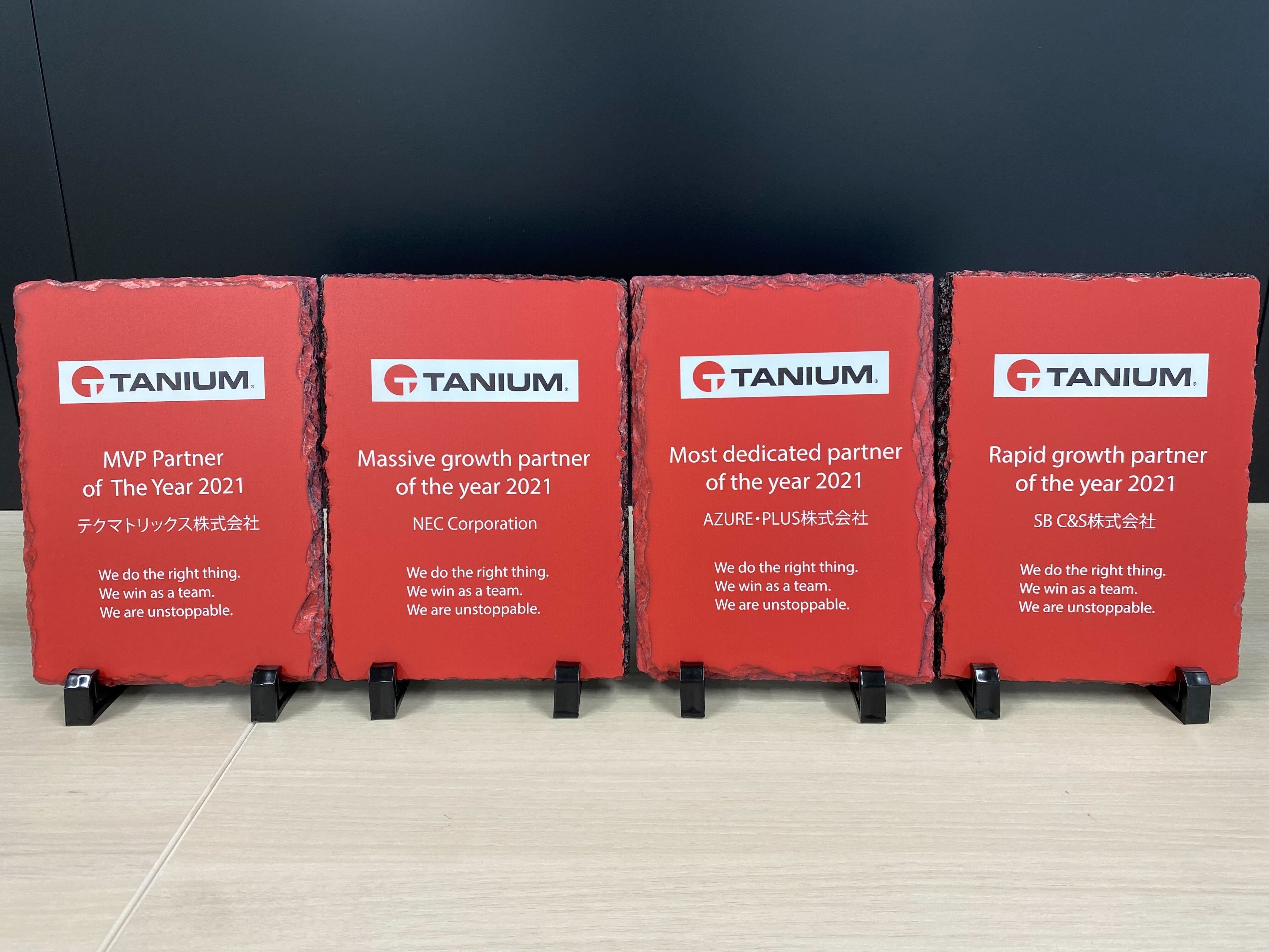 年次で表彰されるTanium Partner Awardは、2021年度 (2021年2月〜2022年1月)において、最も素晴らしい実績を残し、国内のお客様に高い価値のサービスを提供することで、厚い信頼を獲得されたパートナー企業を表彰するアワードです。