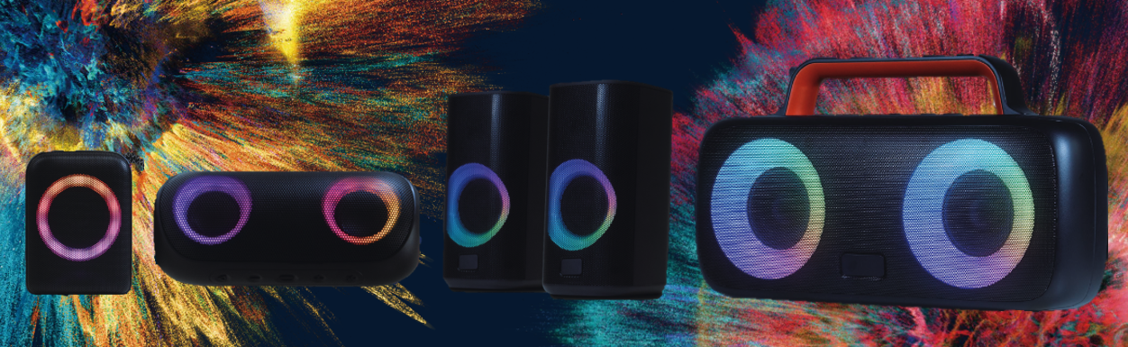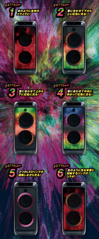 今回発売するスピーカーはこのブランドコンセプトの沿った機能とデザインとなっており、4機種すべてにLEDのリングイルミネーションを搭載している点が最大の特徴。光の色や光り方を複数のパターンから選択可能で、音と光を同時に楽しめるのが最大の特徴となっています。音楽のリズムに合わせて光り方が変化するモードも搭載し、まさに耳と目で楽しめるスピーカーです。
