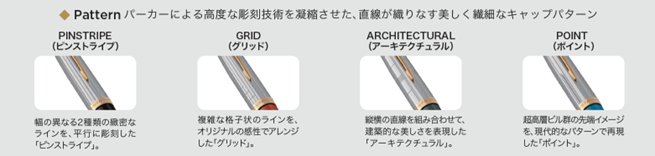 1888年創業。高級筆記具の世界において、130年以上にわたり、革新性、スタイル、独自性の高いクラフトマンシップを追究し続け、お客様に書くことの悦びを提供してきました。パーカーの象徴である「矢羽クリップ」には、「未知の世界に挑戦し、新たな可能性を探し求める志の高い人々の道標でありたい」というメッセージが込められています。