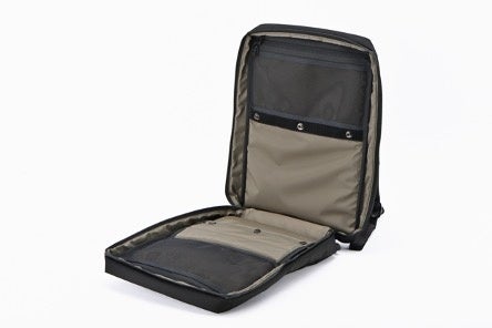 リュックから荷物が取り出しにくくなるのは、上から詰められた荷物が、背負って動くことで混ざりあってしまうからだと考え、リュックの中を仕切りによって「上下2部屋構造」にし、ファスナーもリュックの底まで付けました。こうすることで荷物が混ざりにくくなると共に、1階部分に財布などよく使うものを入れれば、リュックを正面に回して横からワンアクションで出し入れできます。