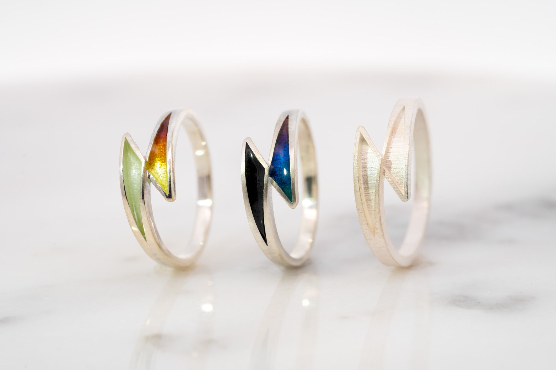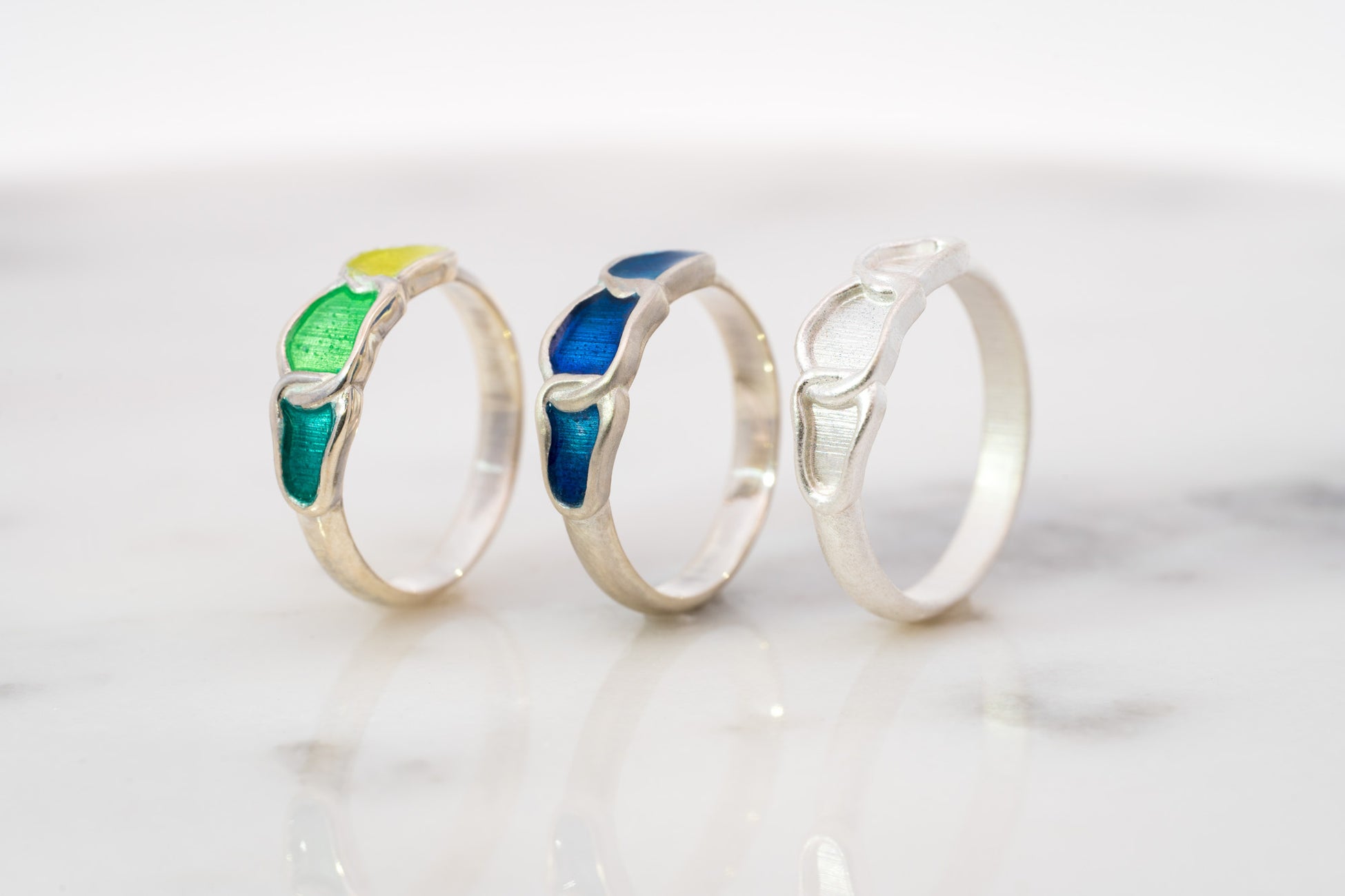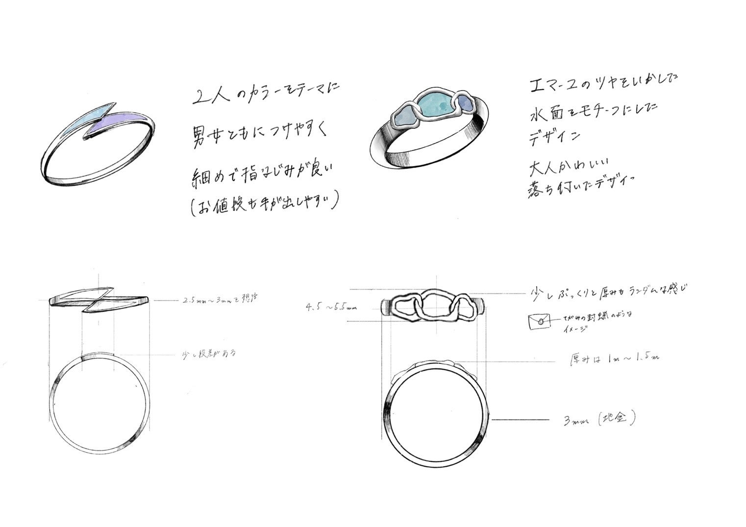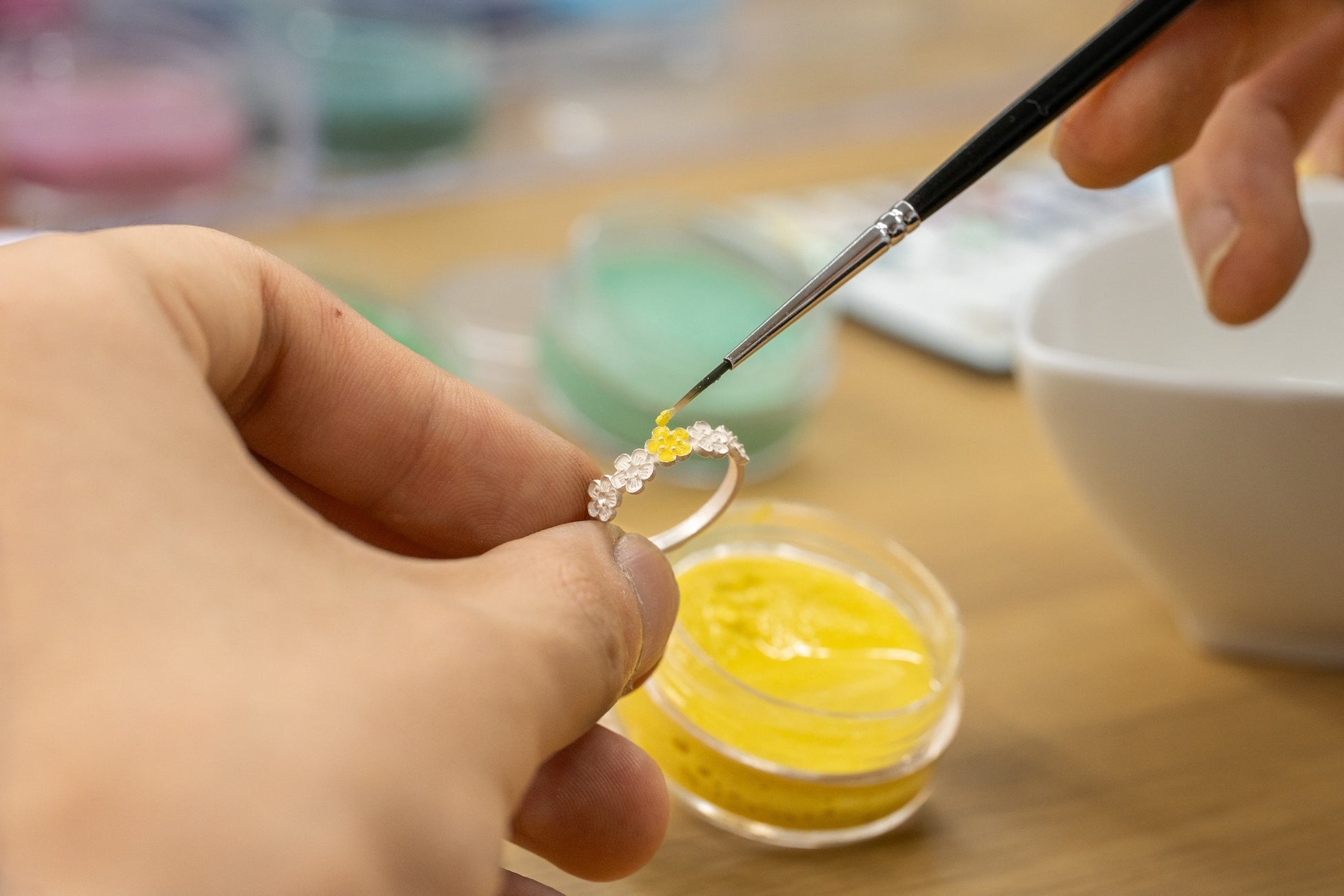 色をのせられるエマーユの特性を活かし、自分で描いた色を身につけられるリングをデザインしました。