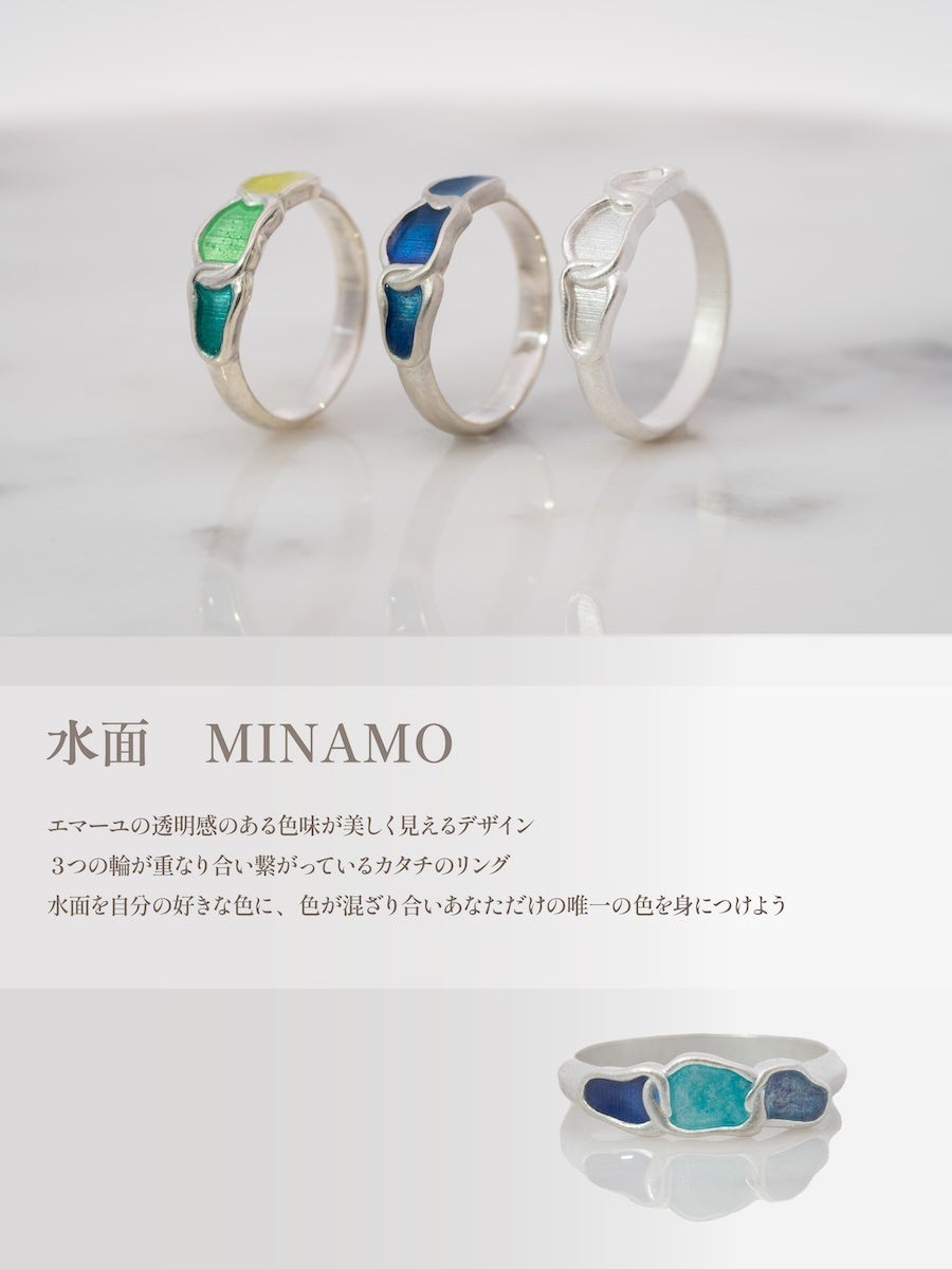 エマーユの透明感のある色味が美しく見える水面をモチーフに3つの輪が重なり合い、繋がっているカタチをデザインしました。