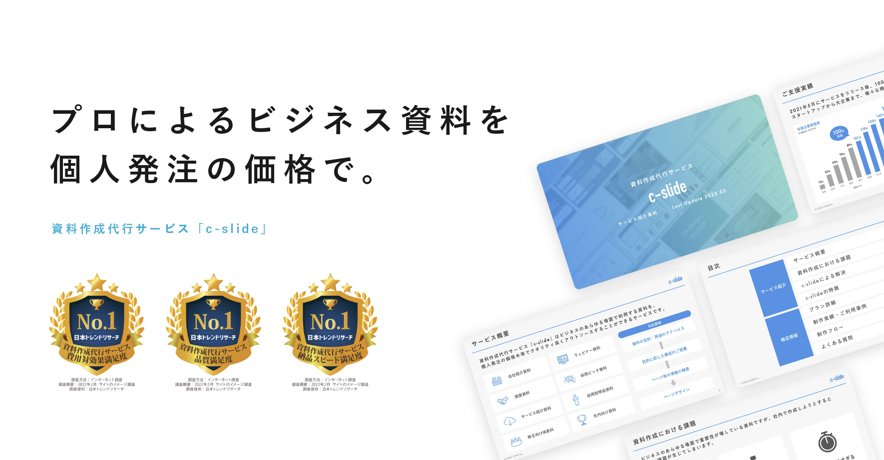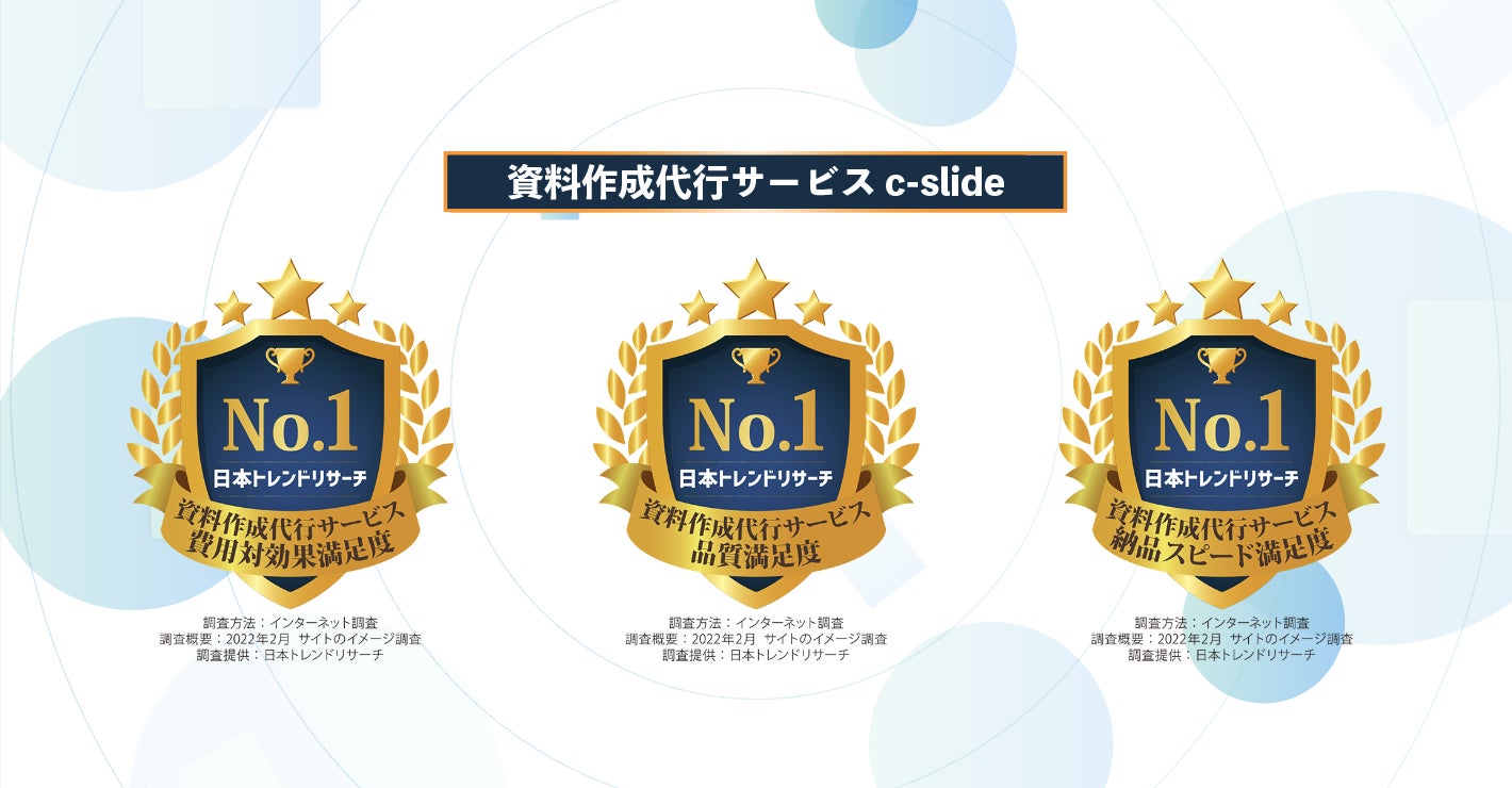 【費用対効果満足度No.1】など、資料作成代行サービスc-slideが3部門で第1位を獲得
