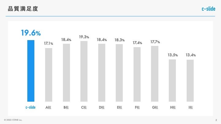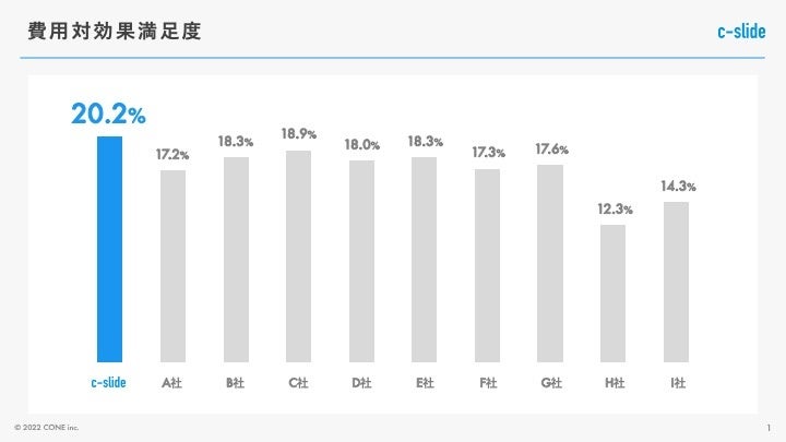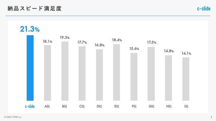 株式会社CONE(本社:大阪府大阪市、代表取締役:佐藤立樹)は、資料作成代行サービス「c-slide」が、資料作成代行サービスにおいて【費用対効果満足度】【品質満足度】【納品スピード満足度】の3部門で第1位を獲得したことをお知らせします。