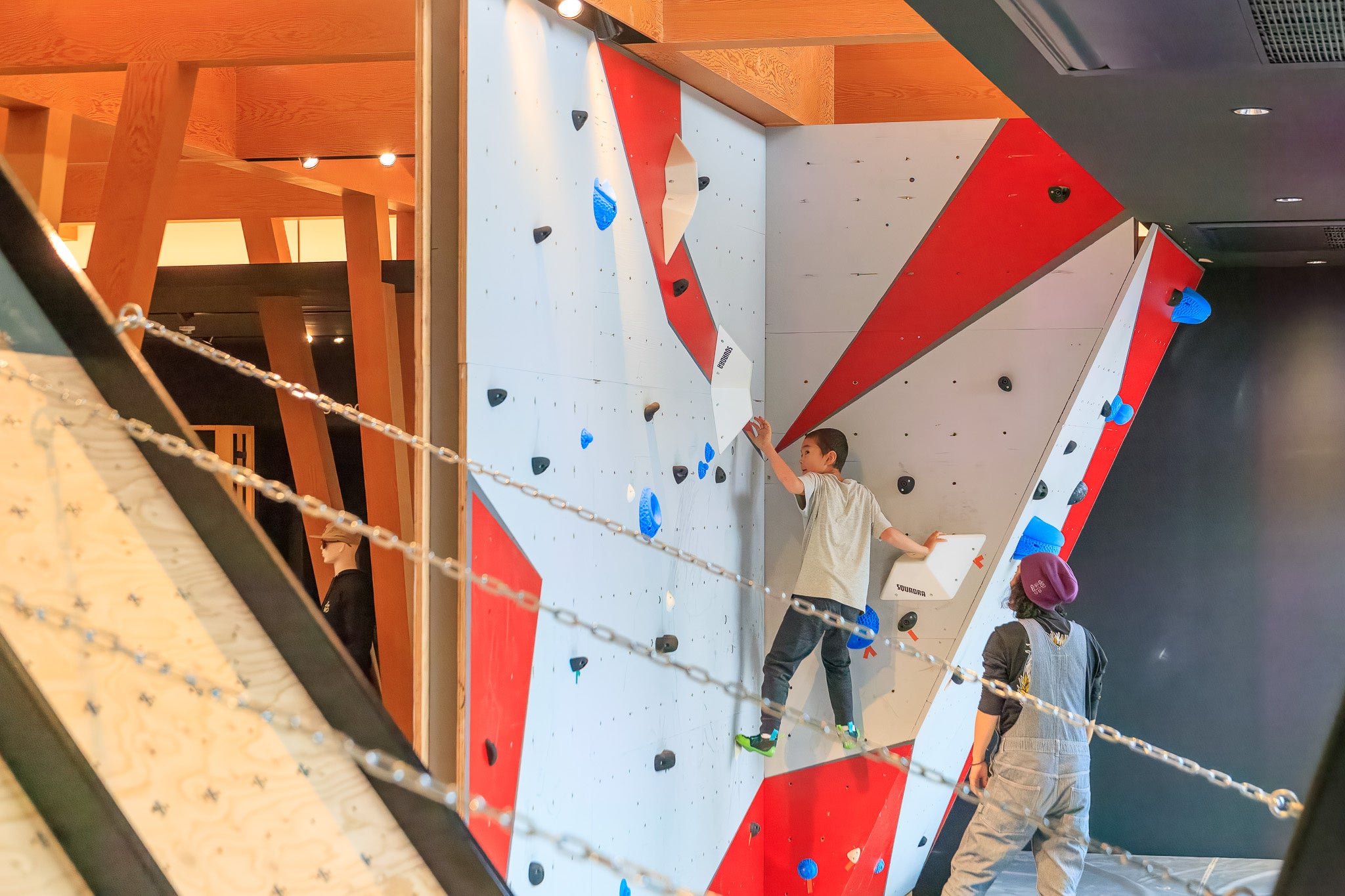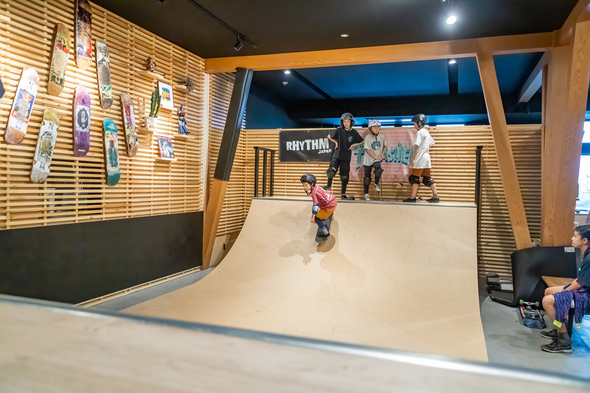 リズムベース アクティビティーセンターでは、インドアボルダリング(キルターボード)、スケートミニランプ、さらにアウトドアスペースには、スケートパーク、パンプトラック、トランポリン、スラックラインなどを設置し、来店者に向けて幅広いアクティビティーを提供致します。