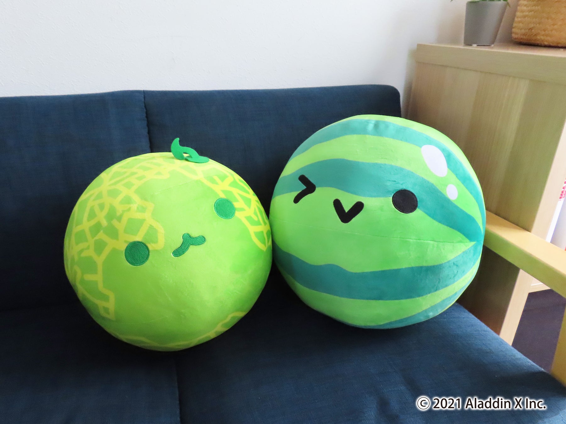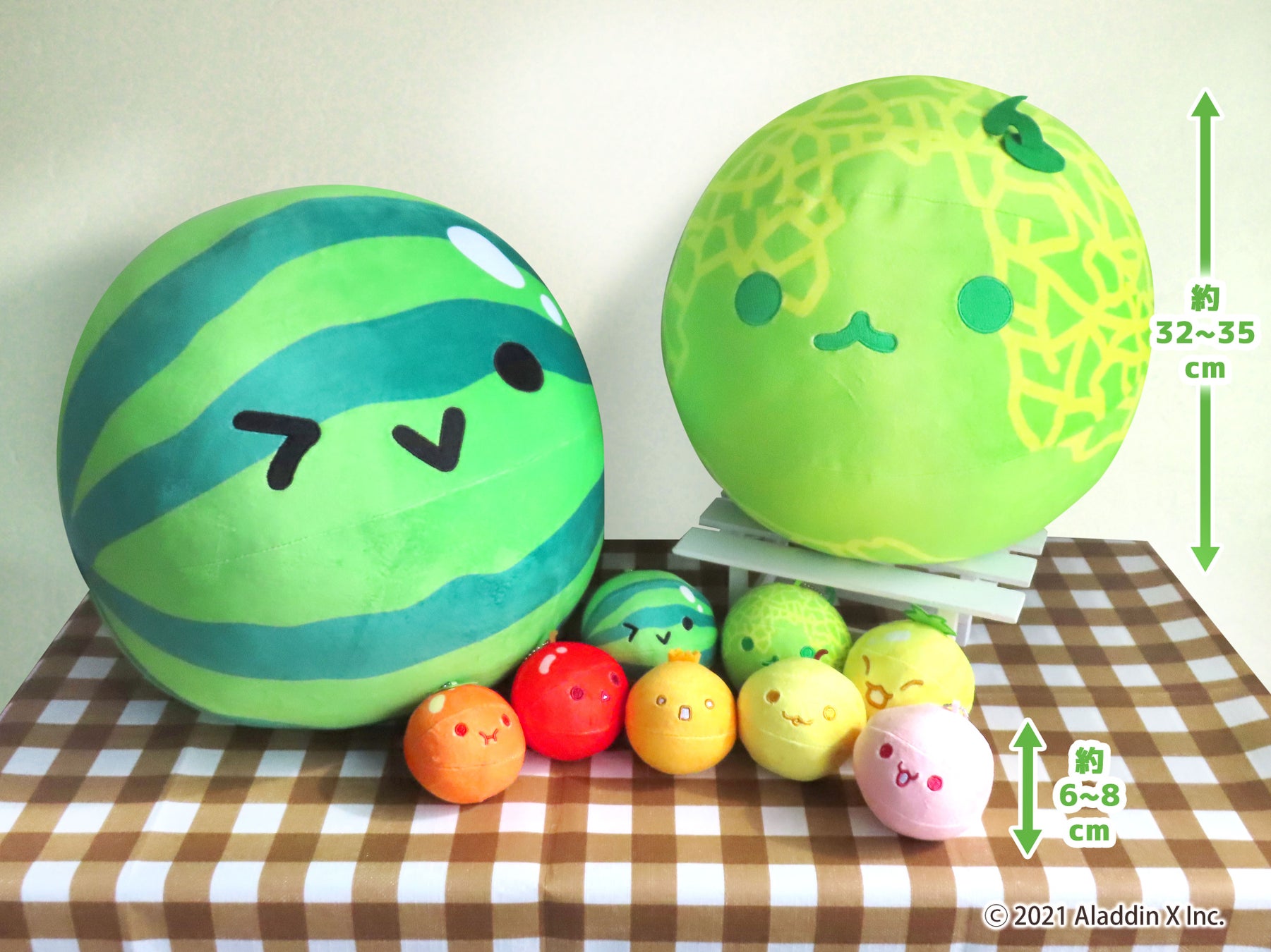BIGぬいぐるみはスイカとメロンの2種で全長も350mmとお部屋のクッションにもピッタリ!