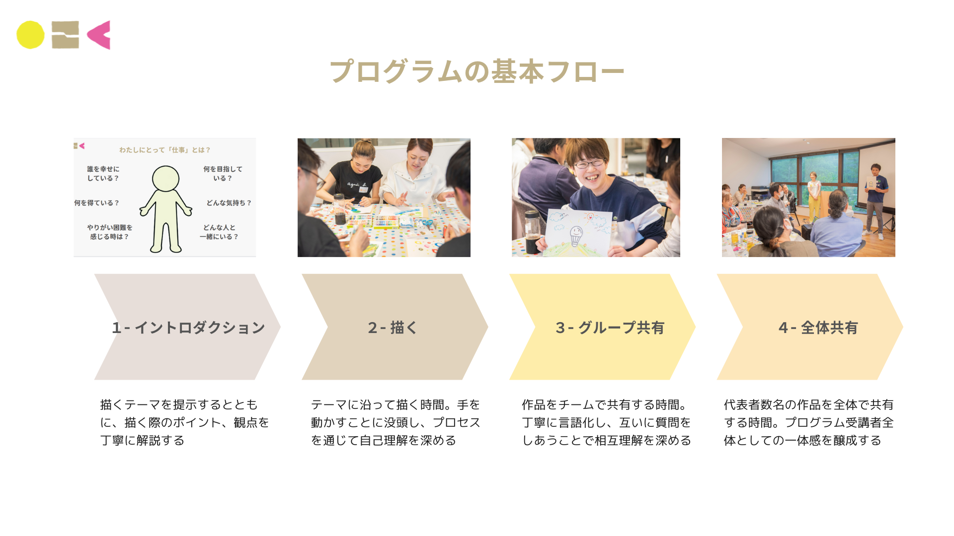 体験会は、通常3時間ほどで行う研修のエッセンスを90分にまとめ、雰囲気や進め方・心の変化を感じていただけるような構成にしております。