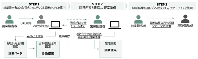 STEP3 営業担当者が管理画面上で診断結果を確認し、お取引先さまのニーズに応じてソリューションの提案を実施