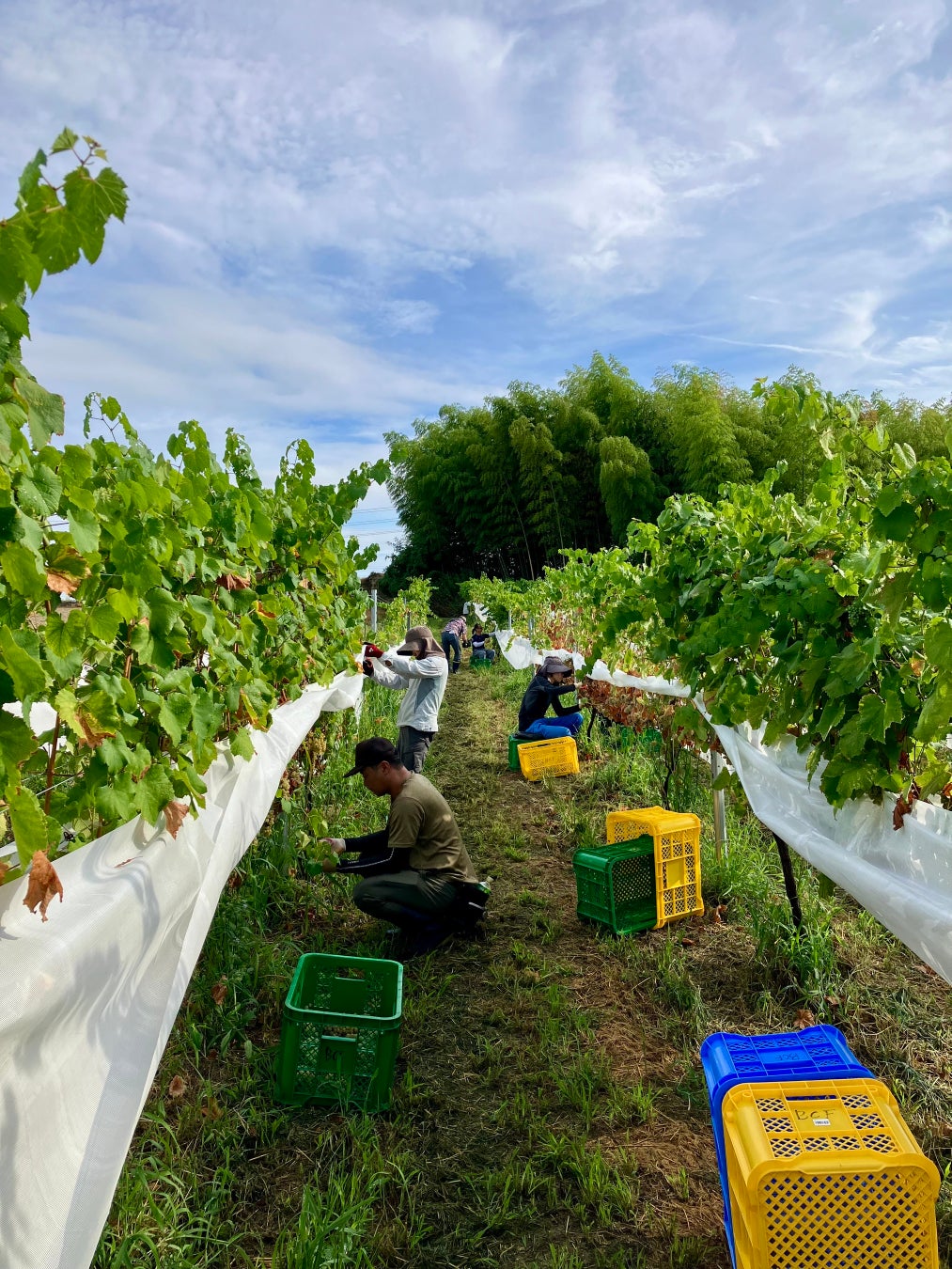 2022年3月に定植(ぶどうの木を植える作業)を行い、2024年8月に初めての収穫を迎えました。