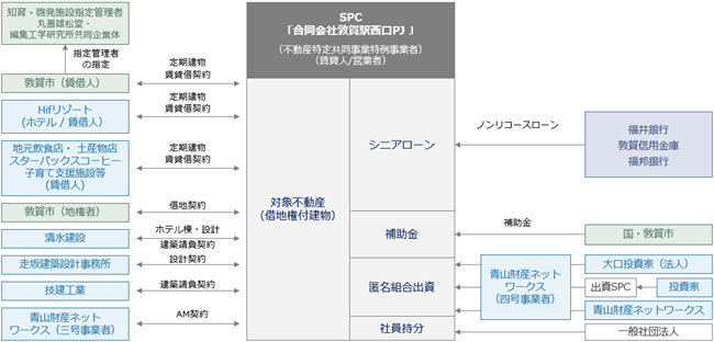当社が取り組んだ「特別目的会社(SPC)を活用した不動産特定共同事業」による地域創生の事例は、2013年改正不特法の「特例事業」を活用した再開発事業です。不動産/公的補助制度による補助金も活用し、建設費を含む事業費約27億円の資金を調達しております。投資家にとっては直接地域創生に貢献する事ができる取り組みです。