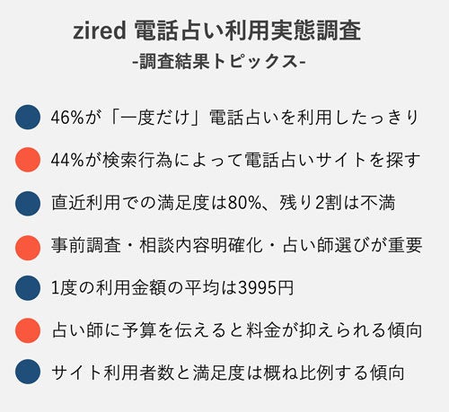 当社メディア「zired」事業ではインターネットユーザーの優れた占い体験を推進することを目的としていますが「優れた利用体験」を生むために重要であるのは、利用者側の意識向上と、適切で健全なサービス提供であると考えています。それらをつなぐ立場であるziredは今回の調査アンケートで、電話占い利用者のニーズや利用実態を正確に把握することができました。そのことが、ユーザーへのより良い占い利用への啓蒙を行うこと、そして占い事業者側がサービス改善を行うためのより良い情報提供に繋がると考えています。