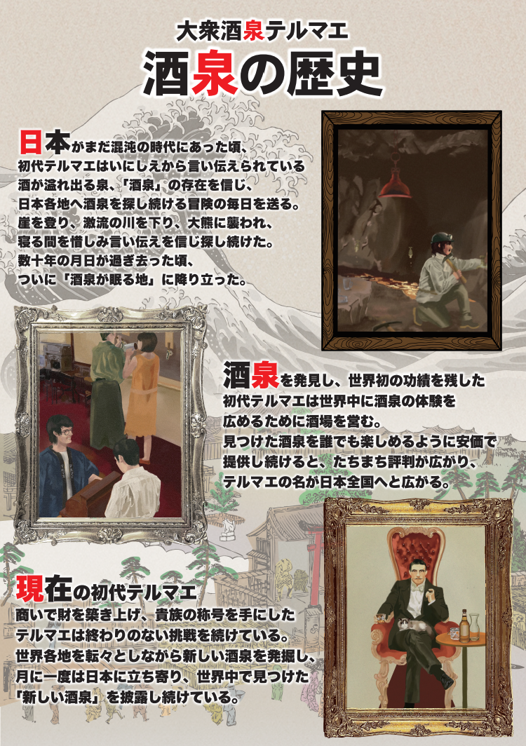 【ひねり蛇口ハイ 大衆酒泉テルマエ】は、伝説の酒の泉「酒泉」の存在を信じ発掘に成功した初代テルマエが世界各地の様々な酒泉を持ち寄り、酒泉を世に広める為に作り上げたお店である。