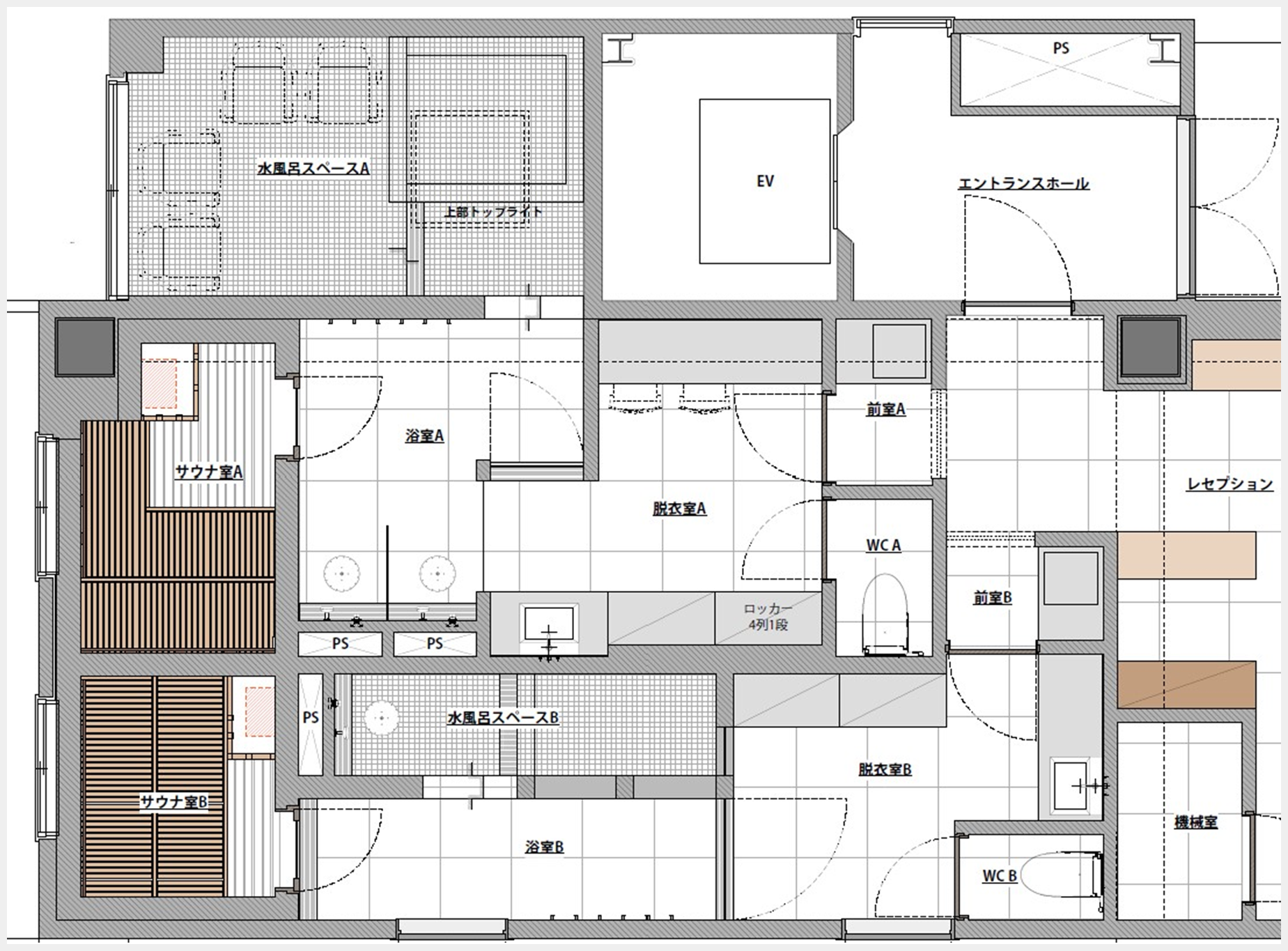 他の空間と色を変えた空間とすることで、サウナ室から水風呂への意識の切り替えを促す計画としています。
