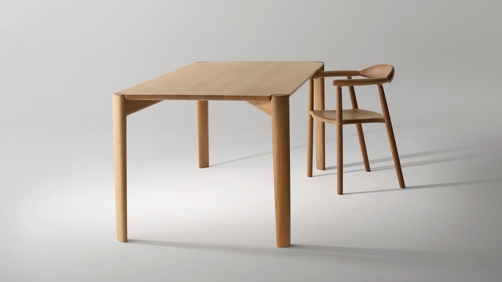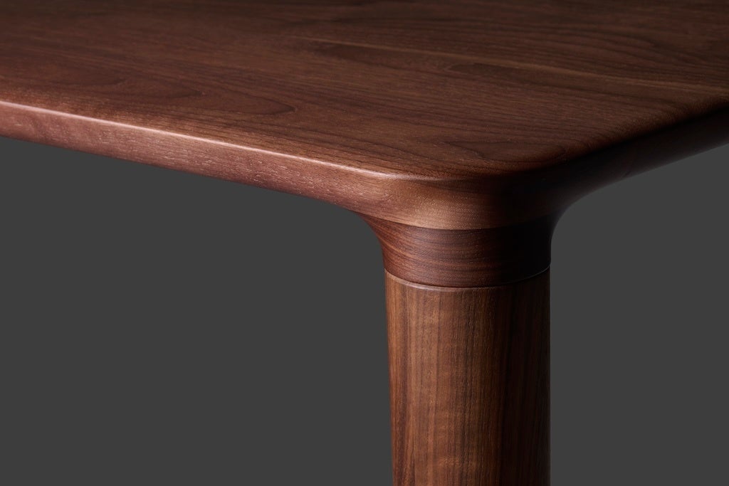 製造を飛驒産業が手がけた無垢材のNeiテーブルは、シンプルな構造でありながら天板と脚との接合部に独自性があり、脚の有機的な曲面と調和した天板形状により、造形美を引き出したデザインです。