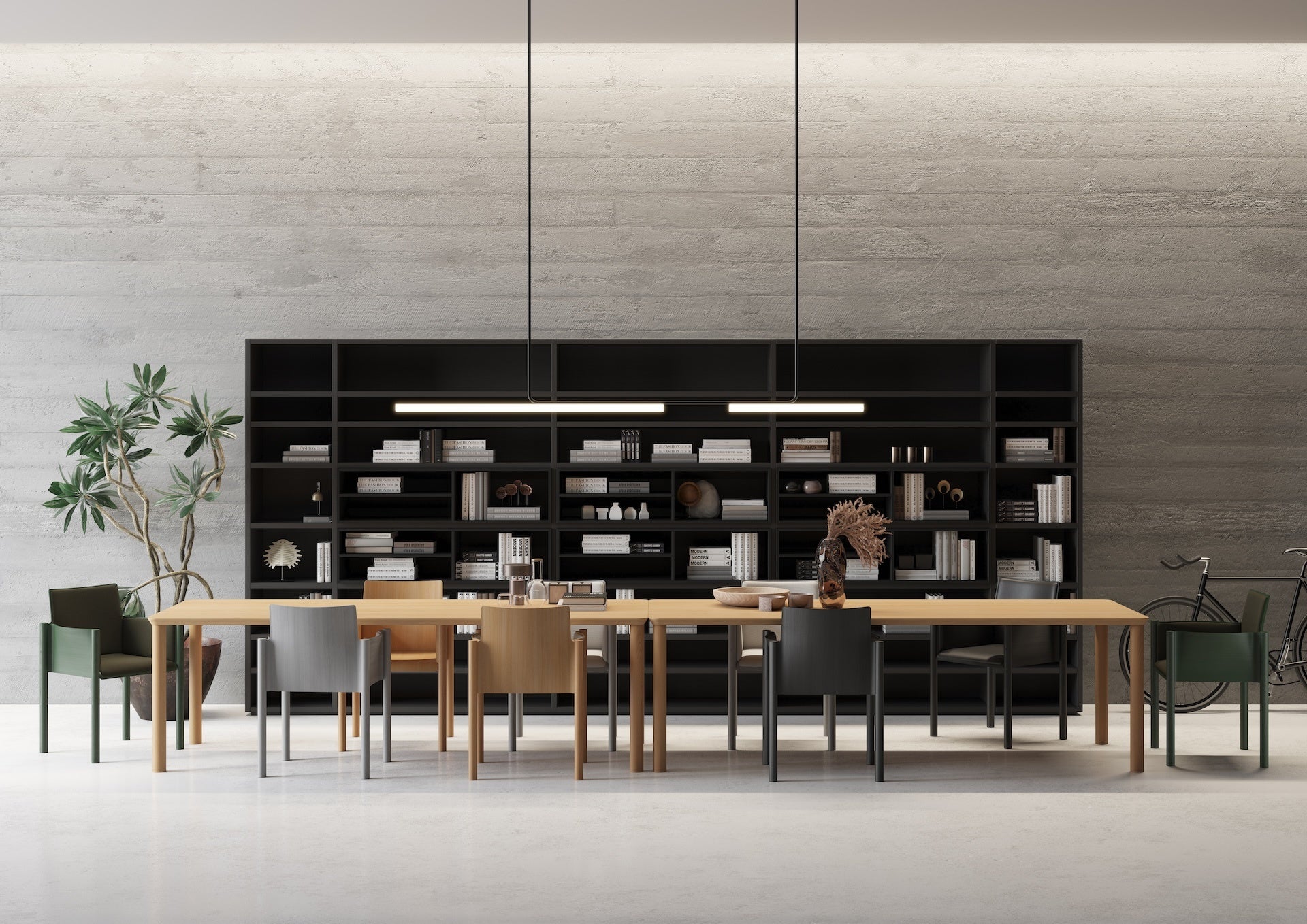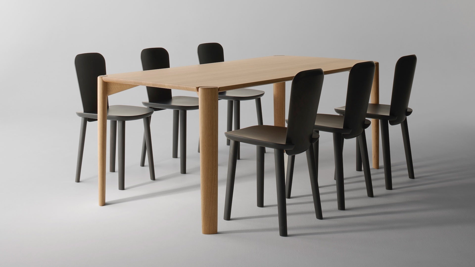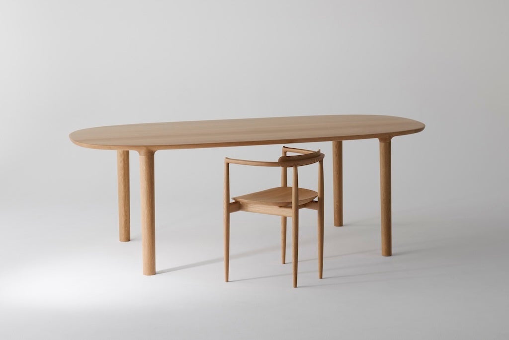 伸縮の影響を受けやすい無垢天板ですが、4本の脚を幕板や樌(ぬき)で繋がない独立した構造にすることで、意匠性を保ちながらもその課題に応えました。ブルレック兄弟がデザインした無垢材のチェア、MusubiアームチェアやShakuチェアにも通ずる、彫刻的パーツを美しく接合するというアイデアが生かされています。有機的な表情を持ちながらも均整のとれたプロポーションのテーブルは円形と長方形があり、あらゆるシーンに対応可能です。一目で印象付ける力強い存在感があるため、KOYORIの個性豊かなチェアラインナップを受け止めてくれるテーブルです。