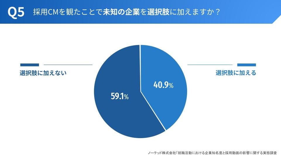 この調査結果から、未知の企業の採用CMに触れることが新たな就職先候補を生む可能性があることが示唆されています。40.9%の就活生が未知の企業の採用CMを視聴することで、その企業を新たな選択肢として検討することが分かりました。