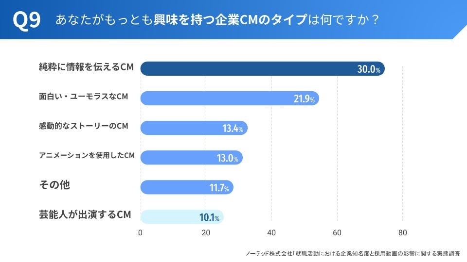 このアンケート結果は、求職者がもっとも興味を持つ企業CMのタイプについての傾向を示しています。「純粋に情報を伝えるCM」が30.0%と最も多く、企業の具体的な情報を直接受け取りたいという需要が高いことが分かります。次いで「面白い・ユーモラスなCM」が21.9%となり、エンターテイメント性の高いCMに対する関心も確認できます。一方で、13.4%の「感動的なストーリーのCM」、13.0%の「アニメーションを使用したCM」、そして10.1%の「芸能人が出演するCM」と、多様なCMスタイルへの需要も存在します。