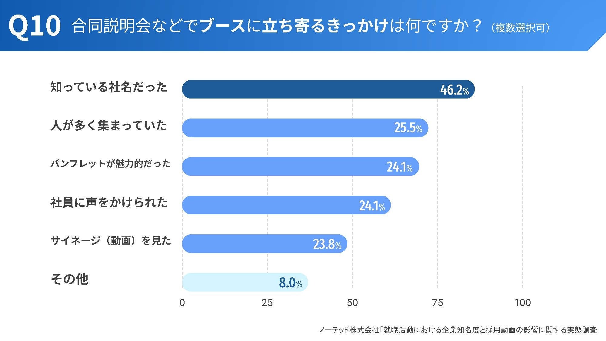 最後に、合同説明会などで立ち寄るきっかけ(Q10)では、「知っている社名だった」が最も多かったことから、求職者が行動を起こす上で企業の存在感が大きく影響を与えることが理解できます。