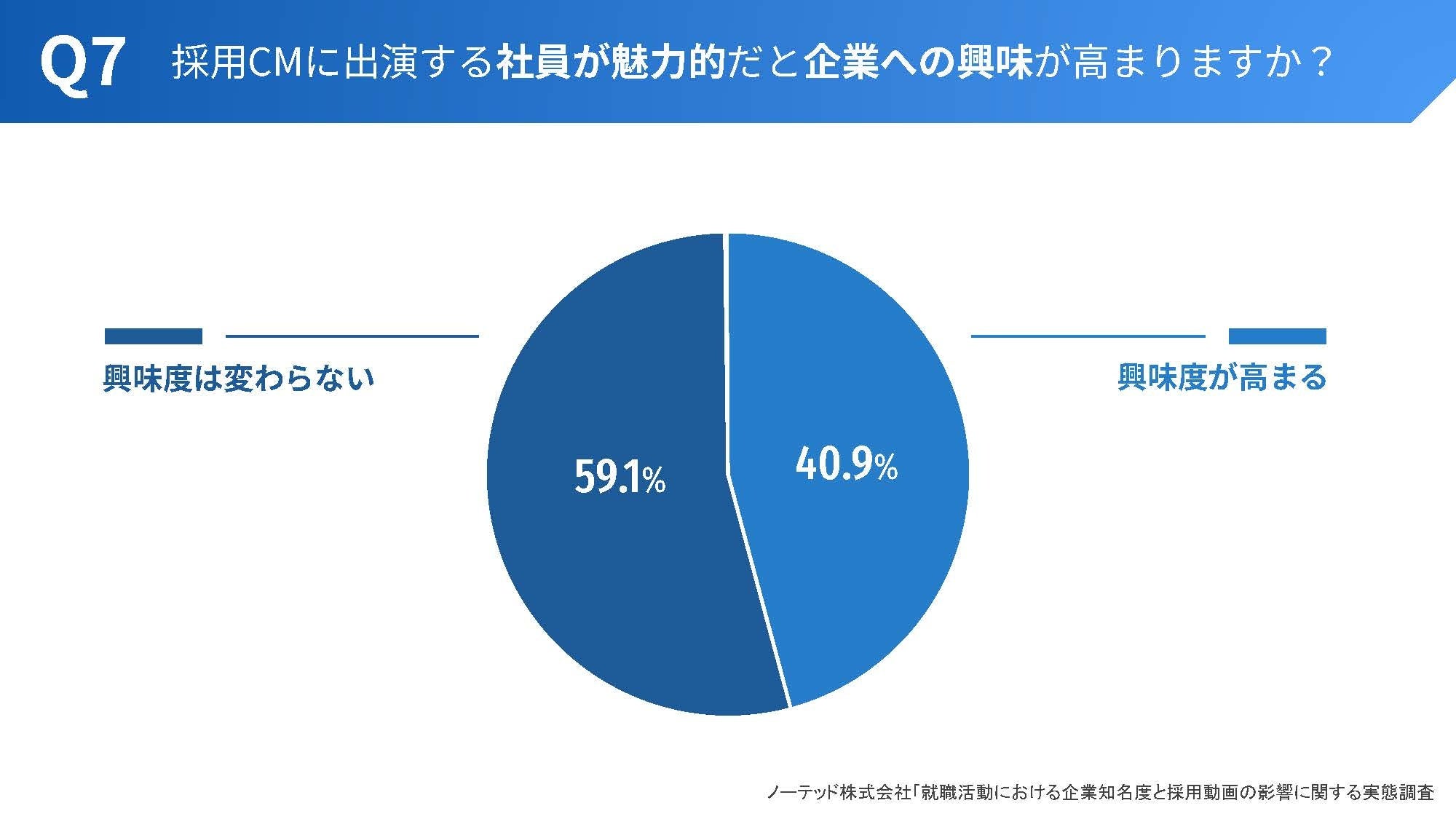その他の質問においても、未知の企業の採用CMによりその企業を新たな選択肢として検討する(Q5)、CMが企業への興味度を上げる(Q6)、CMに出ている人々の魅力により興味が高まる(Q7)という回答がそれぞれ40%以上あり、求職者に企業の存在を知らせることの重要性を裏付けています。