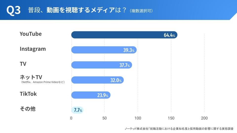 このアンケートの結果から、現在の求職者が主にどのメディアで動画コンテンツを視聴しているかが明らかになりました。全体の64.4%という高い比率を示しているのがYouTubeです。TV(37.7%)やネットTV(Netflix、Amazon Prime Videoなど、32.0%)、そしてInstagram(39.3%)など他のメディアと比べても、YouTubeの視聴率は顕著に高いことが見て取れます。