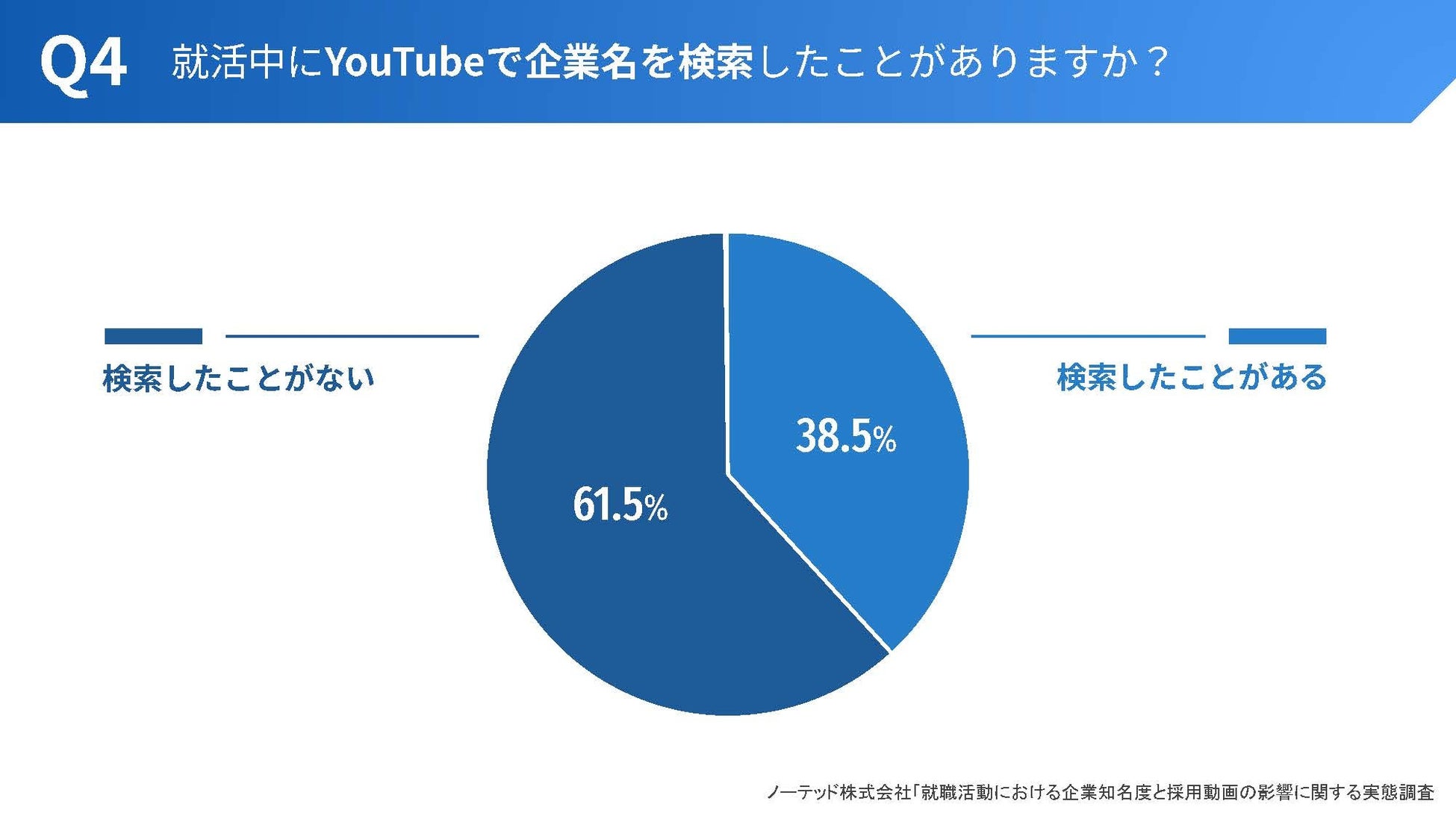 アンケート結果から、求職者の38.5%が就活中にYouTubeで企業名を検索した経験があるとのことです。一見すると、これは少数派の行動のように思えるかもしれません。しかし、この数字は非常に重要な意味を持っています。
