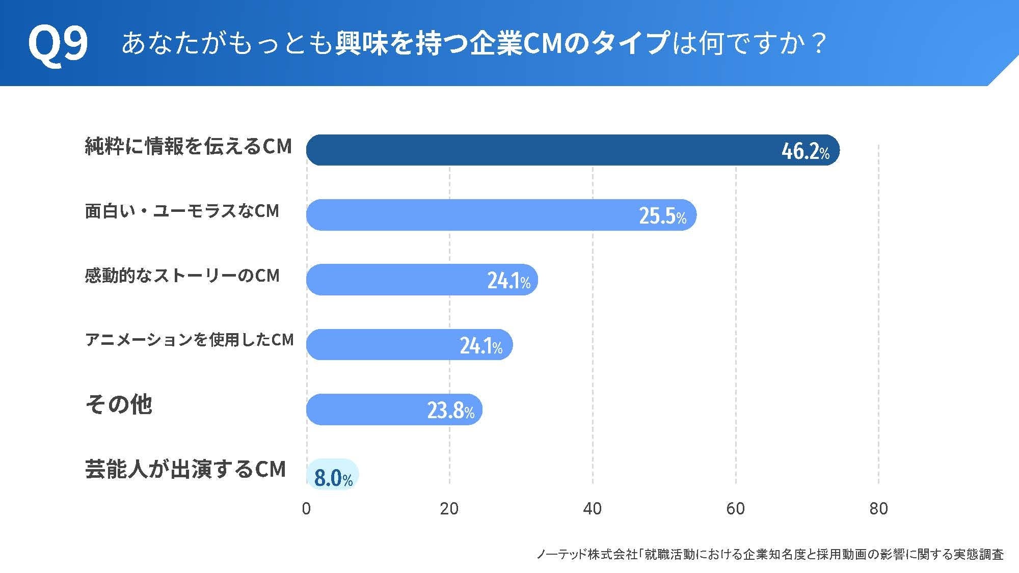 具体的な人物に注目する点として、「働いている社員の出演(32.4%)」や「企業の代表の出演(20.2%)」も求職者の興味を引きます。しかし、これらは企業全体の情報と一緒に提示されたときにより効果的であると考えられます。これらの結果は、採用CMが求職者にとって、企業全体のビジョンや目指している姿を短時間で理解する重要なツールとなっていることを示しています。