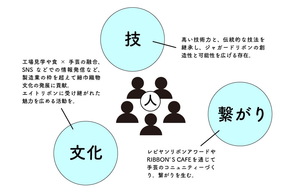 RIBBON'S CAFE・オリジナルリボンブランドであるレピヤンリボンの運営や、一般の方々向けの工場見学といった挑戦を続け、この工場と、この工場の持つ可能性を残すことで、いつかエイトリボンがチロルリボン業界を牽引していく存在になり、産地にとって、日本にとって、財産になるような工場になっていくと信じています。